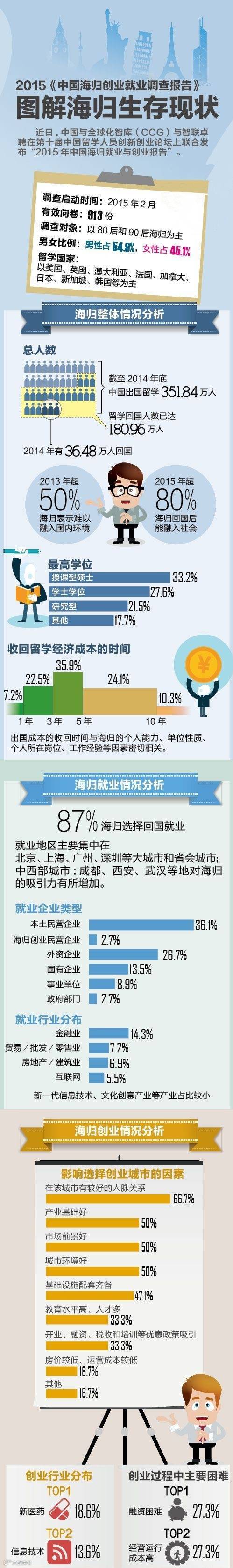 2014年,中国留学回国人数达到36.48万,比2013年增加了1.13万,增长了3.20%。截至2014年,中国留学回国累计总人数已达180.96万,占出国留学累计总人数的51.4%。海归人数的增加与我国综合国力的增强及政府加大吸引人才的力度有关。随着大批海归回国发展,他们的就业和创业情况也备受社会各界关注。