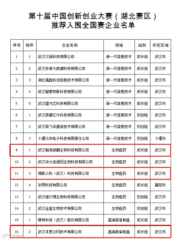 日前,根据省科技厅关于第十届中国创新创业大赛(湖北赛区)推荐入围全国赛和晋级湖北赛区决赛企业名单的公示,确定了入围第十届中国创新创业大赛全国赛湖北赛区的企业29家(成长组企业20家,初创组企业9家)和晋级湖北赛区决赛企业51家(成长组企业33家,初创组企业18家)。