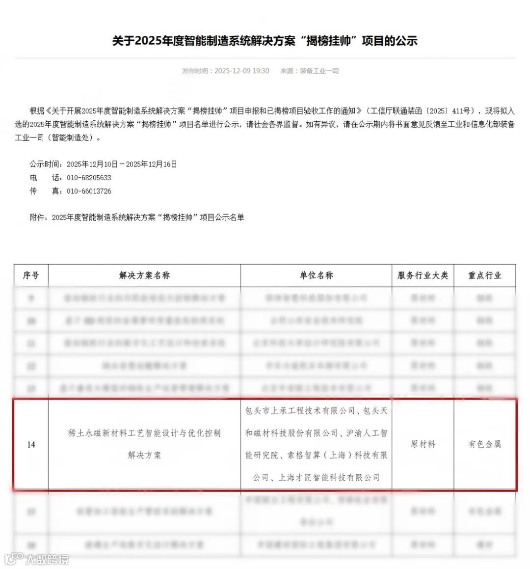 近日,国家工信部发布了2025年度智能制造系统解决方案“揭榜挂帅”项目公示名单,由上海交通大学重庆人工智能研究院(以下简称”研究院”)、包头市上承工程技术有限公司、包头天和磁材科技股份有限公司、索格智算(上海)科技有限公司、上海才匠智能科技有限公司共同申报的“稀土永磁新材料工艺智能设计与优化控制解决方案”成功入选。