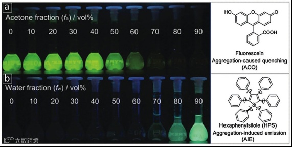 (ACQ与AIE现象对比图,来源https://doi.org/10.1002/asia.201801469)