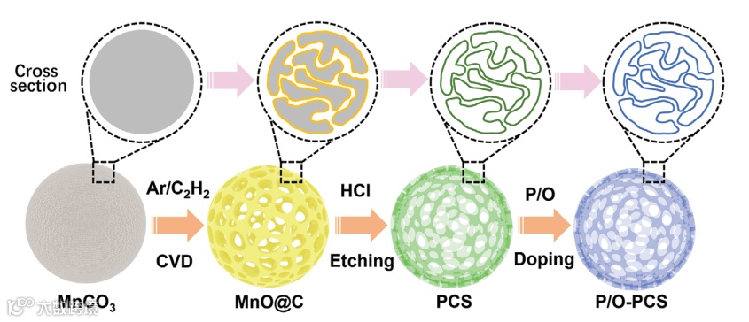 探索具有良好电化学性能的钾离子混合电容器负极材料是目前科学界的研究热点。低成本和高比容量的硬碳作为钾基储能的负极材料具有巨大的潜力。然而,它们缓慢的反应动力学和不可避免的体积膨胀降低了它们的电化学性能。近日,悉尼科技大学研究人员通过合理的纳米结构设计和杂原子掺杂策略,利用化学气相沉积技术制备出了一种具有优异电化学性能的多孔碳球材料。相关工作以题为“Phosphorus and Oxygen Dual-Doped Porous Carbon Spheres with Enhanced Reaction Kinetics as Anode Materials for High-Performance Potassium-Ion Hybrid Capacitors”发表在期刊 Advanced Functional Materials上。
