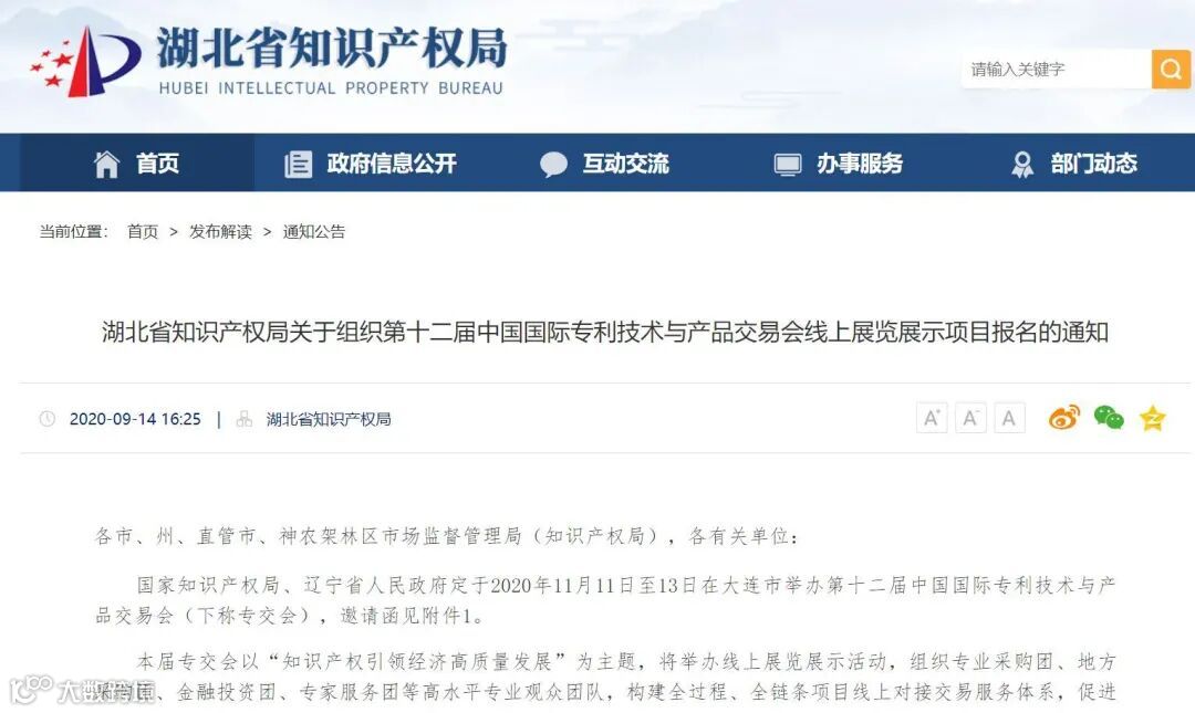 国家知识产权局、辽宁省人民政府定于2020年11月11日至13日在大连市举办第十二届中国国际专利技术与产品交易会。