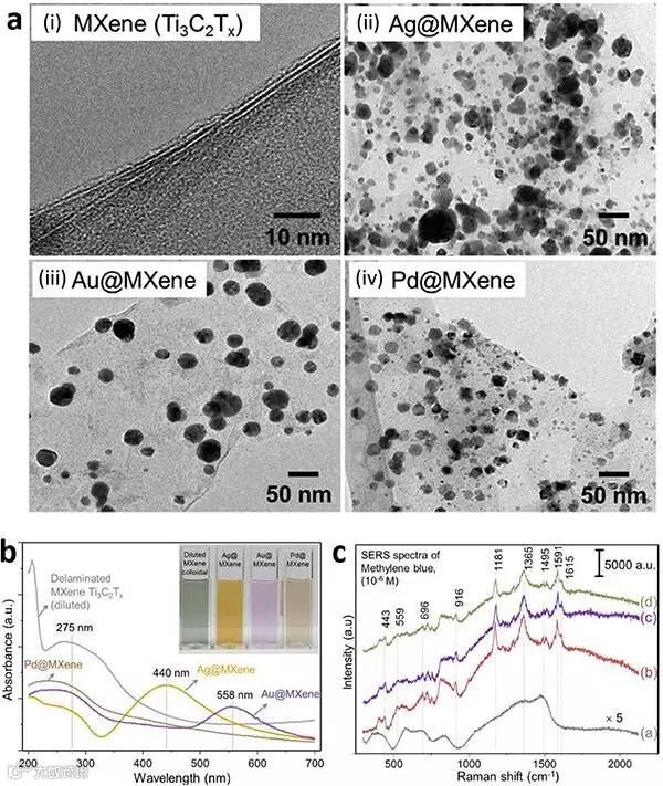(a)原始MXene纳米片的高分辨率TEM图像,以及Ag@MXene,Au@MXene和Pd@MXene杂化纳米片的低分辨率TEM图像;