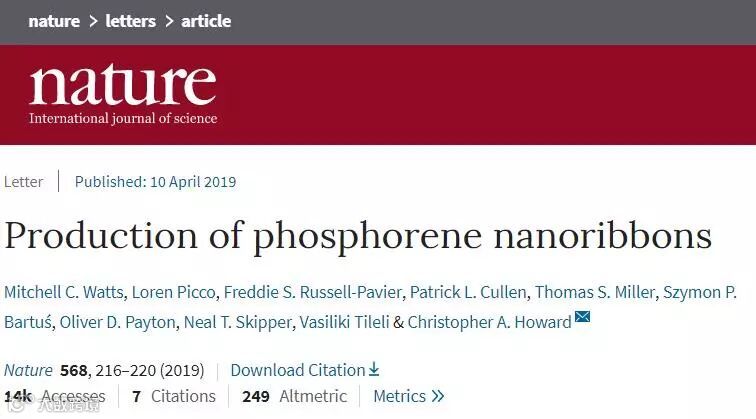 伦敦大学学院的C. A. Howard(通讯作者)等人利用“离子剪(Ionic scissoring)”的形式对黑磷晶体进行处理,获得了大量高质量、单个磷烯纳米带(PNRs)。这一自上而下的方法主要分为两步,首先将黑磷块体利用锂离子进行插层处理,获得的产物之后浸没在质子惰性的溶剂中并进行机械搅拌,最终产生稳定分散的PNRs溶液。由此制备的PNRs具备4-50nm不等的宽度,主要为单层厚度,测量长度可达75μm,纵横比最高可达到1000左右。研究还发现该纳米带材料为原子级单晶,以Z字形晶体取向进行排列对齐。这一简单的液相制备方法为实验研究磷烯纳米带的性质及其应用奠定了基础。