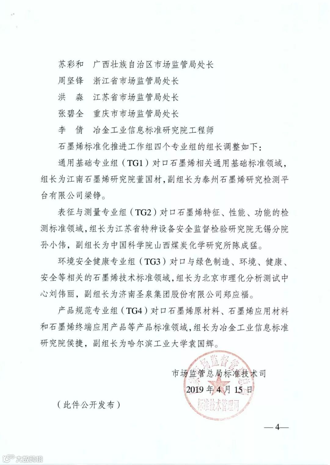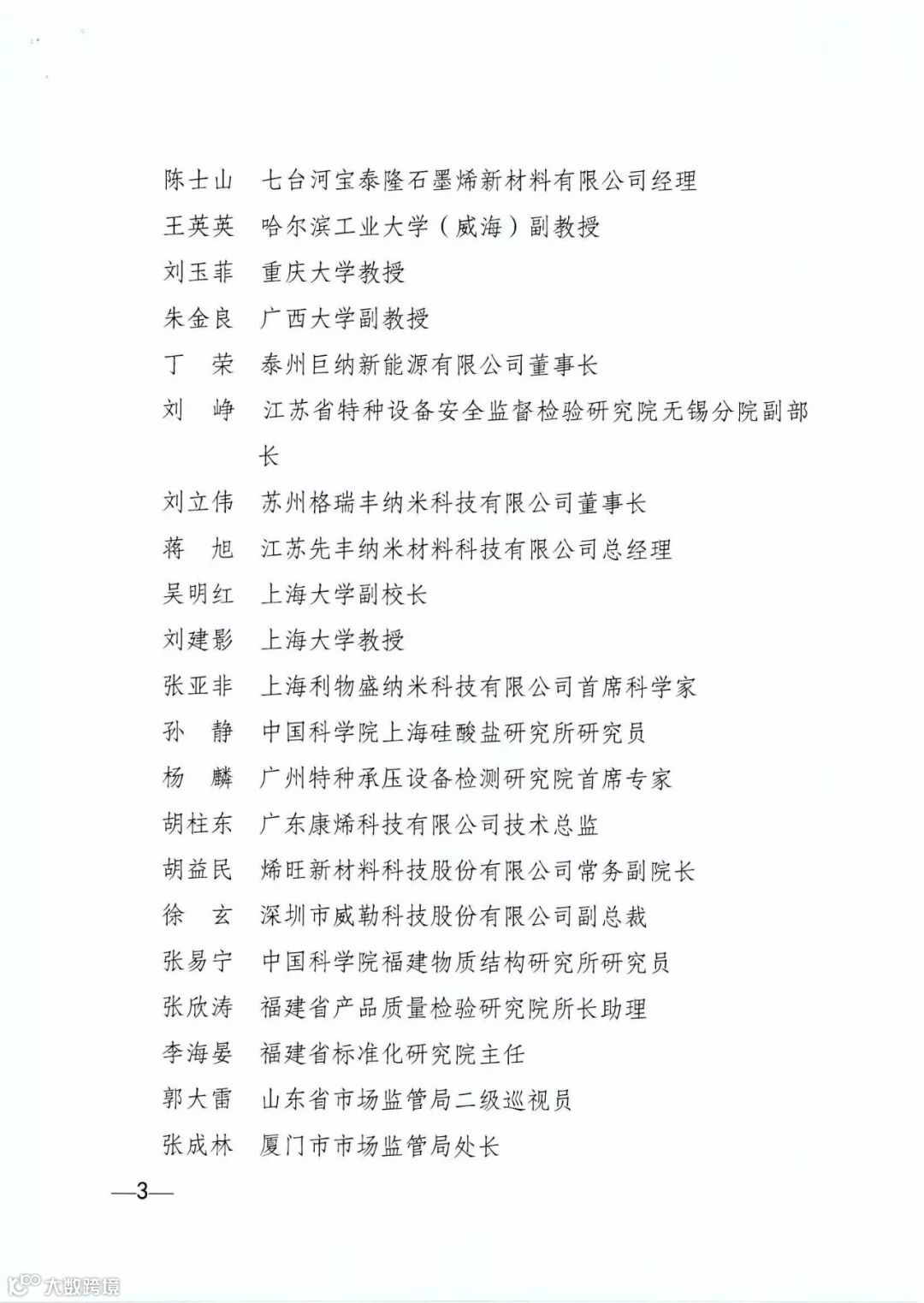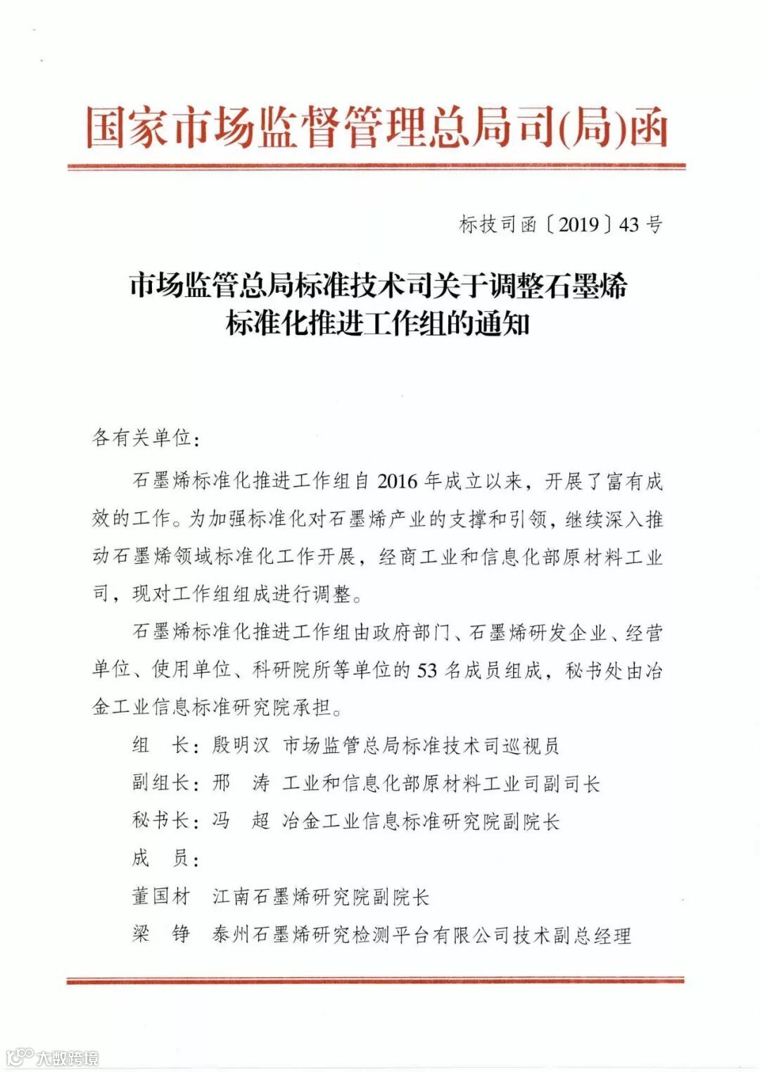 为加强标准化对石墨烯产业的支撑和引领,继续深入推动石墨烯领域标准化工作开展,国家市场监督管理总局对2016年成立的石墨烯标准化推进工作组的组成进行了调整。先丰纳米董事长蒋旭先生入选该工作组。石墨烯标准化推进工作组成立以来,统筹推进石墨烯国家、国际相关标准化工作,开展了卓有成效的活动。