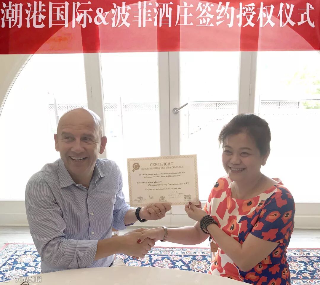 这次签约,潮港国际董事长李黔女士亲自从国内飞往法国波菲酒庄大本营,酒庄庄主Didier Cuvelier也亲自接待了李黔女士,双方在酒庄内正式签署品牌授权仪式。