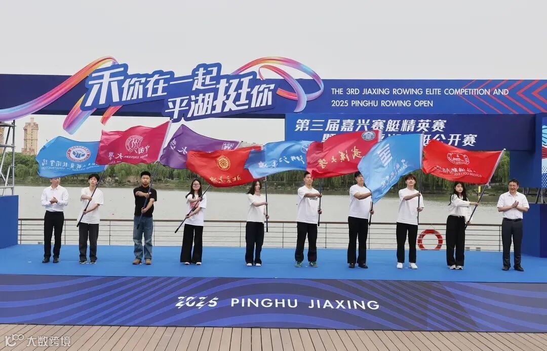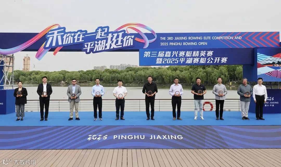 出席活动的领导和嘉宾以及参加此次比赛的裁判员和领队代表共同启动了第三届赛艇精英赛暨2025平湖赛艇公开赛。