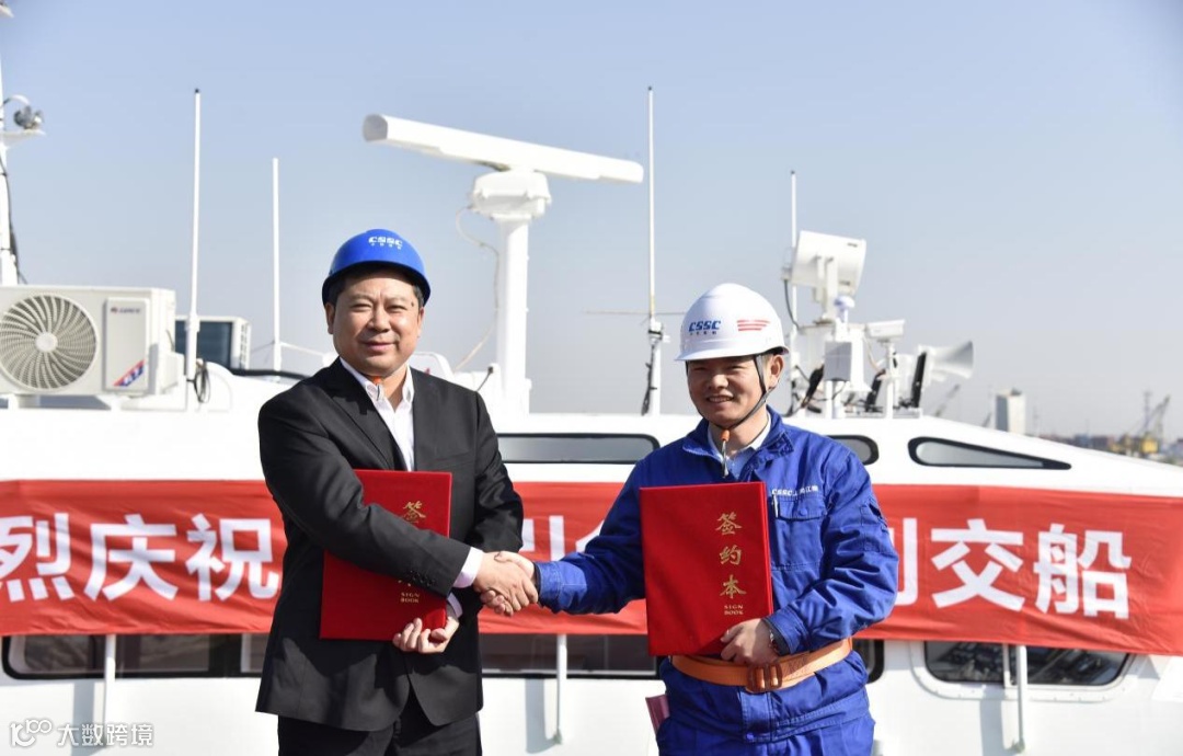 仪式上,江苏海畅船舶服务有限公司总经理杭建军与上海东真船舶工程有限公司副总经理金国林签署交船文件。