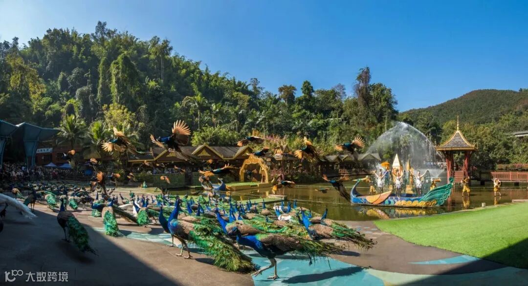 婉转悠长的哨声响起,成群结队的孔雀优雅华丽的从雨林深处迎面飞翔下来、掠过波光粼粼湖面来到您的面前。
