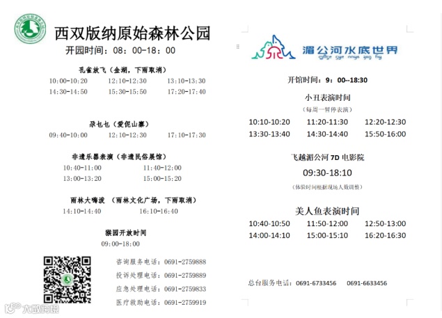 (注意:结合公园实际情况,适时会对表演场次及时间进行调整,更多详情请关注“西双版纳原始森林公园”微信公众号,或拨打咨询服务电话:0691-2759888、0691-2759889、0691-2759833)