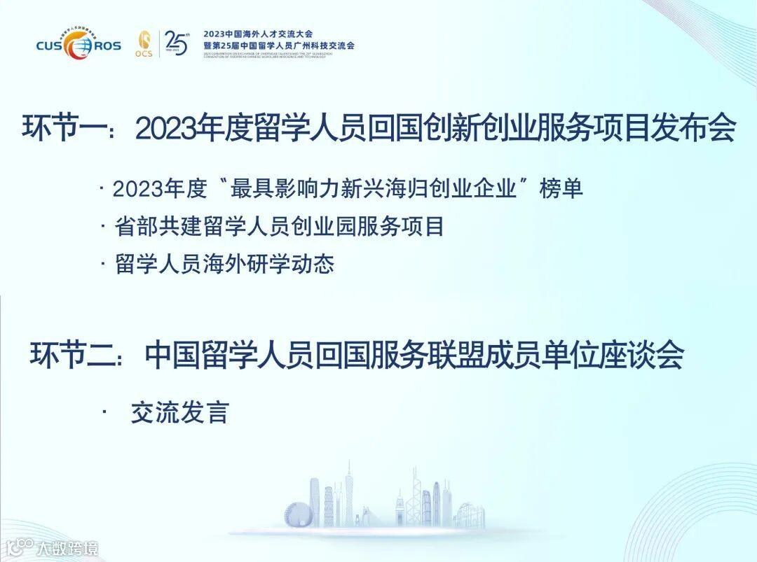 会议共设置2023年度留学人员回国创新创业服务项目发布会和中国留学人员回国服务联盟成员单位座谈会两个环节。