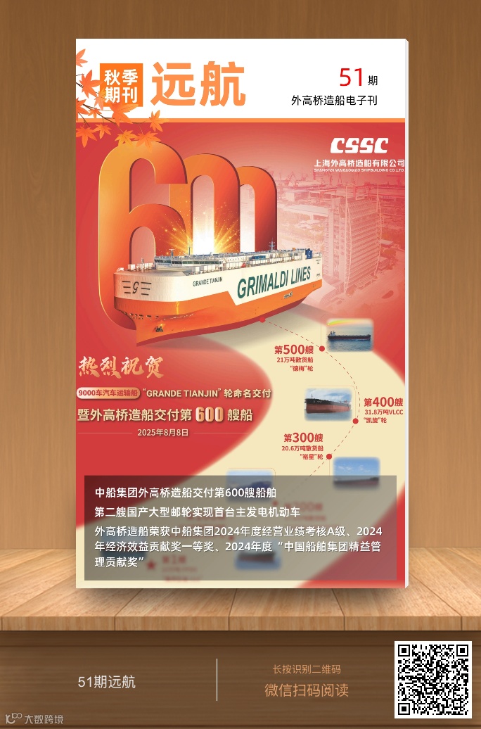 《远航》季度杂志致力于为所有外高桥造船人忠实记录公司以“邮轮引领、一体两翼”战略为导向,在高端制造和绿色转型道路上的扎实进展。从一次次技术突破到一项项荣誉获得——这里呈现的,不仅是该如何建造船舶,更展现出所有外高桥造船人筑梦深蓝的匠心职守和船厂温度,公司迈向更高水平智造的真实历程。