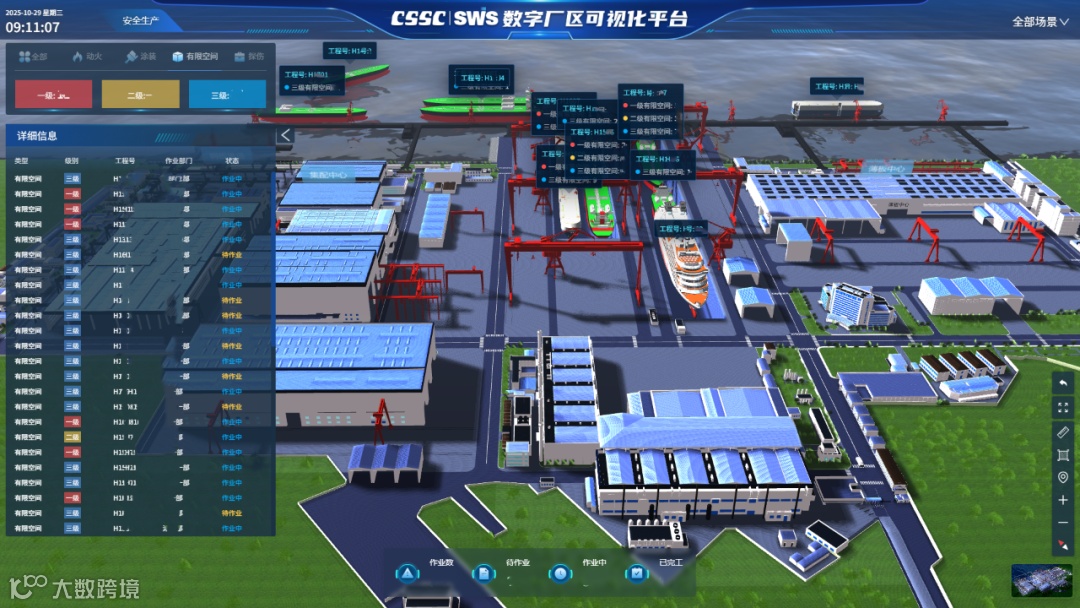 安全是建造工作的首要前提。数字孪生平台依托地图底座构建起全方位安全防控体系,通过电子围栏预警、风险区域动态监控、危险作业全程跟踪等功能,将传统安全管理从被动响应转变为主动预防,提前规避安全风险,全方位守护作业人员安全与生产稳定,为船舶建造工作筑牢安全屏障。