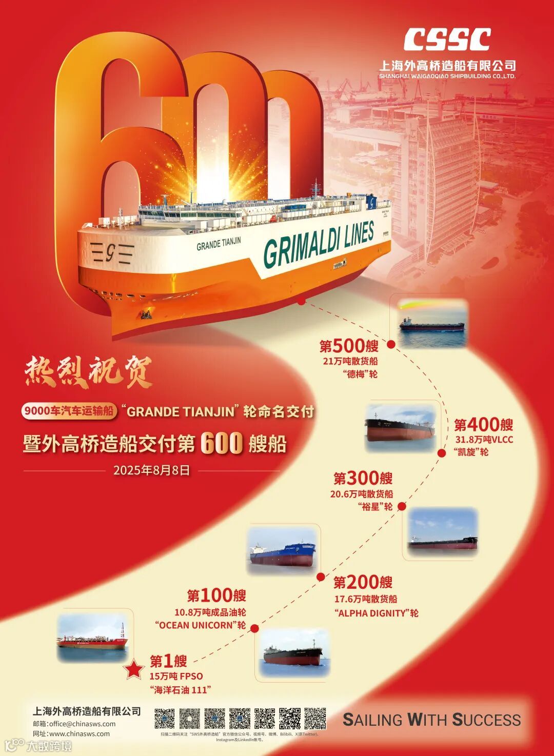 8月8日,由中国船舶集团有限公司旗下上海外高桥造船有限公司为意大利Grimaldi公司建造的首艘9000车位汽车运输船“GRANDE TIANJIN”轮命名交付。至此,外高桥造船自2003年交付首制船15万吨级海上浮式生产储油装置(FPSO)“海洋石油111”以来,累计完工交付600艘(座)船舶及海工平台共计1亿202万载重吨,以年均27艘/463.7万载重吨的交付效率持续刷新中国造船业纪录,生动展示了公司高质量发展硬核实力和成果,也参与和见证着千禧年以来中国船舶工业从小到大、由弱到强、从追赶到并跑再到引领的华丽变身。