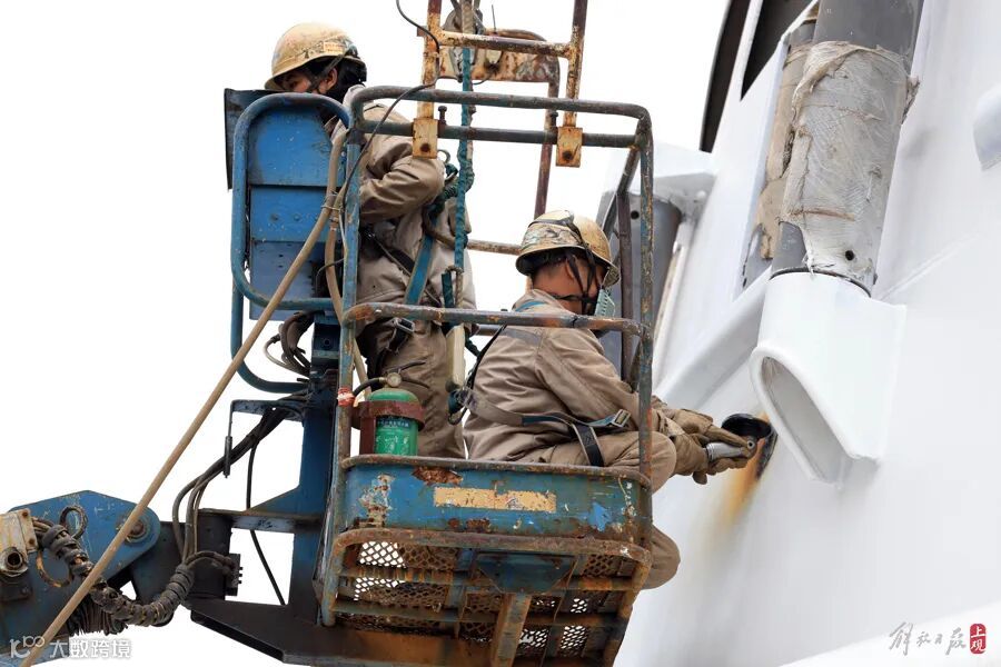 工人们在为邮轮分段进行高空打磨及涂漆作业。
