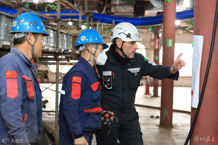 中外技术人员在邮轮建造现场交流设备安装事宜。