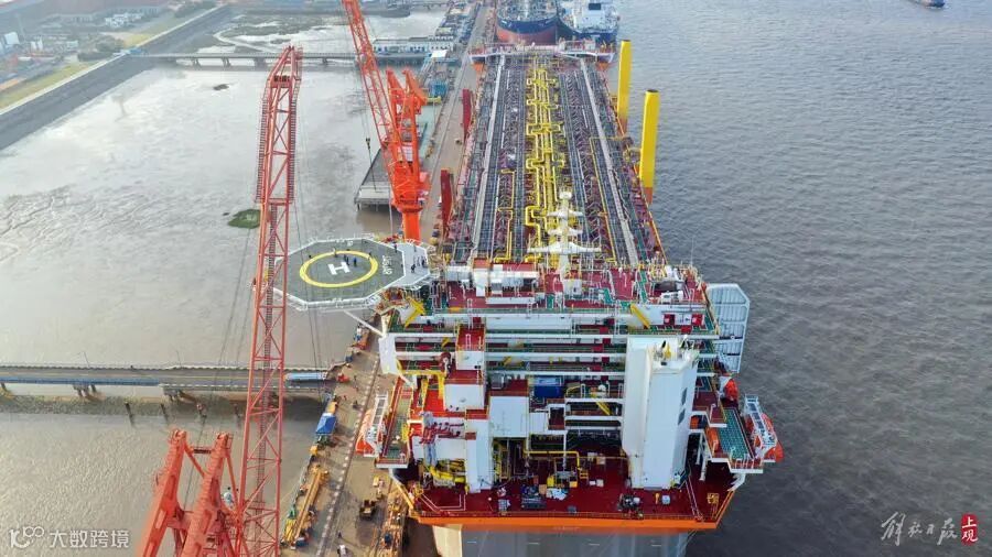 油轮南缘的体量更大的海上浮式生产储油船(FPSO)捷豹号即将驶离,其于11月14日向荷兰客户交付,这已是外高桥造船向该船东建造的第五艘FPSO,至此,该公司累计完工交付579艘(座)船舶和海工平台/1亿2587载重吨,不仅成为全球唯一一家能够同时建造大型邮轮、大型民船和大型海洋工程装备的船企,也成为我国第一家完工总量突破1亿载重吨大关的船企,成为中国造船新标杆。