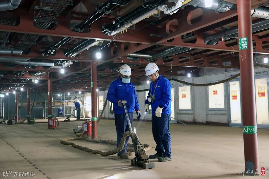 邮轮内部,方卫民和同事用进行电磁矫平作业。