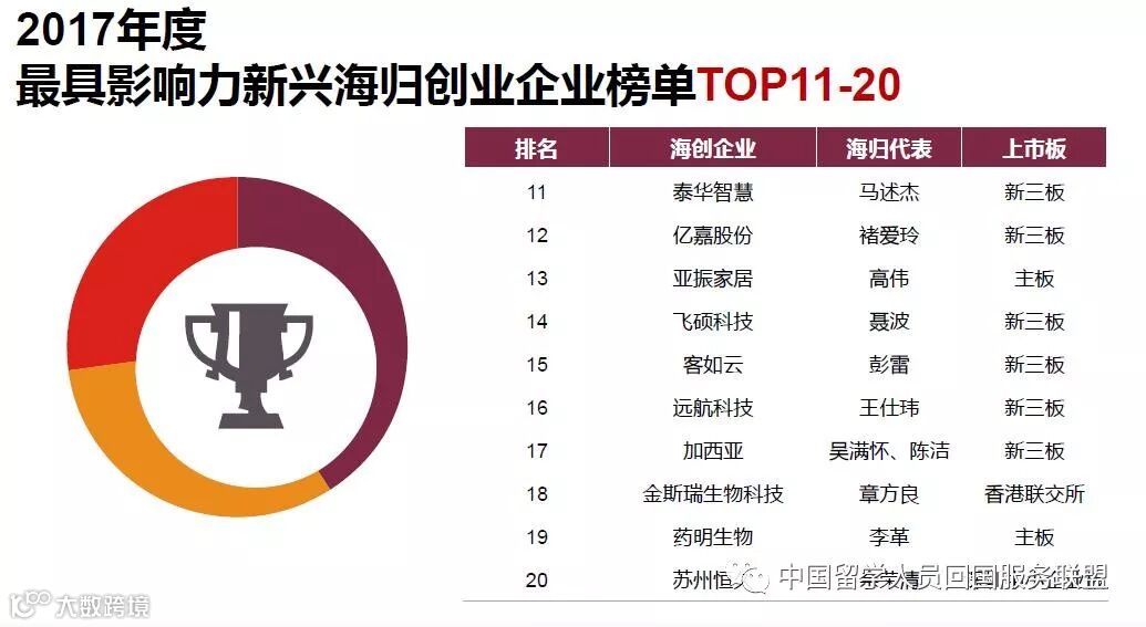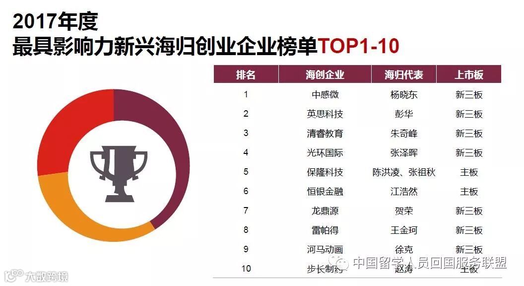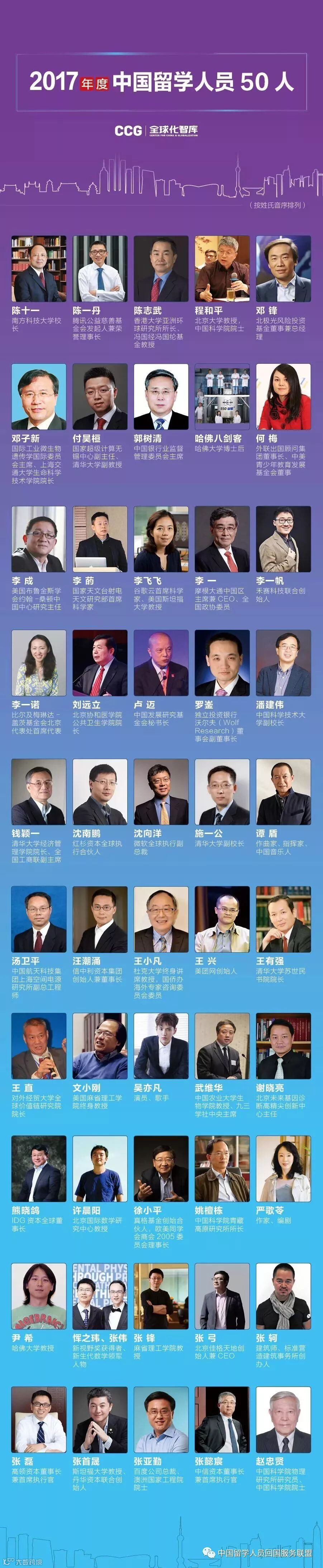 王辉耀代表中国留学人员回国创业专家指导委员会发布“2017年度最具成长潜力的留学人员创业企业”榜单;中国国际人才专委会秘书长、全球化智库(CCG)副主任兼秘书长苗绿在会上发布了“2017年度中国留学人员50人”榜单,陈十一、潘建伟、张首晟、赵忠贤、谭盾、沈南鹏、汪潮涌、张亚勤,卢迈,徐小平、严歌苓、吴亦凡、李成、李飞飞、李一诺、以及“哈佛八剑客”等50位2017年在学术、科研、政界、商界、医药、创业、投资、教育、公益、文艺等领域有着突出表现的杰出留学人员入选榜单。零点有数数据科技集团国际关系与社会发展事业部研究总监杨宇发布了“2017年度最具影响力新兴海归创业企业”榜单。