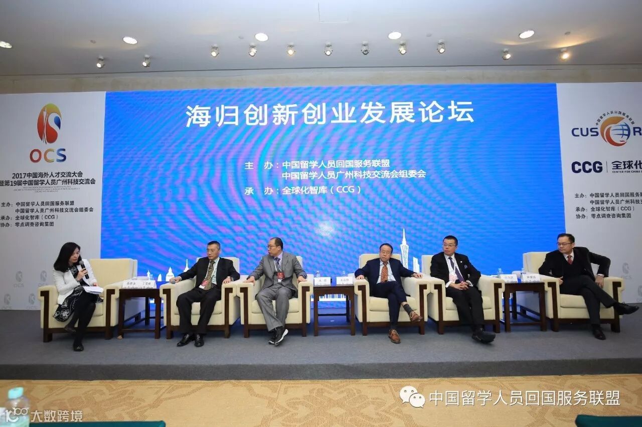 12月21日,作为“2017中国海外人才交流大会暨第19届中国留学人员广州科技交流会”重要活动之一,中国留学人员回国服务联盟在"海交会“期间成功举办“2017中国海归创新创业成果发布会暨海归创新创业论坛。国务院参事、全球化智库(CCG)理事长、欧美同学会副会长、中国留学人员回国创业专家指导委员会副主任王辉耀、人社部留学人员和专家服务中心副主任李璟、广州市人力资源和社会保障局副巡视员陈玉元出席活动。人才领域专家学者、留学人员创业企业代表,地方政府、全国各地园区代表,留学回国服务工作专家以及来自世界各地的留学人员,全国主流媒体等100余人参加了活动。