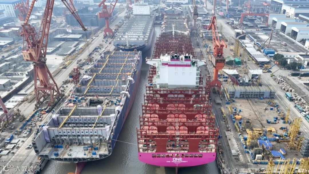 公司为中国台湾T.S.LINES建造的第四艘7000TEU集装箱船H1560船和为SEASPAN建造的第六艘7000TEU集装箱船H1567船完成半船起浮。