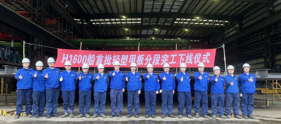 本次下线的423/433分段是公司首制8600车双燃料汽车运输船H1600首批轻型甲板。公司在大型邮轮薄板建造经验基础上,围绕薄板工艺难点,进一步深化技术提升,采用了钢板多次校平、激光切割、T梁流水线制作、激光复合焊、焊接机器人等工艺以及“新六无”(无马脚、无引熄弧板、无支撑、无过度打磨、无额外力输入、无过度火工)作业法,高质量完成了建造任务并一次性通过验收,树立了薄板建造新标杆,同时也拉开了PCTC连续建造的序幕。