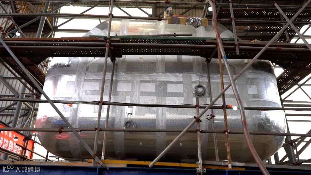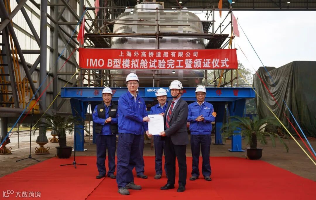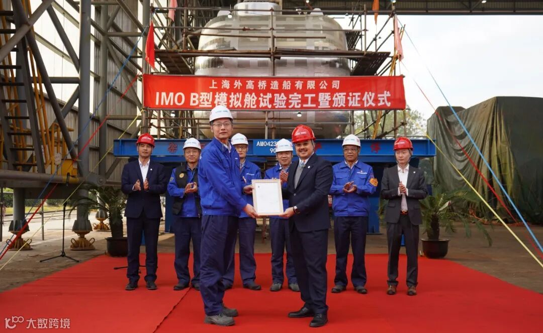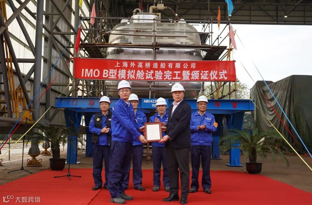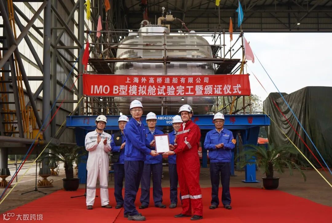 该B型模拟舱舱容为48立方米,舱室及气室外形和节点型式皆与实船舱型保持一致,材质为9NI钢,本次模拟舱建造完工,验证了外高桥造船自主完成B型舱的设计、生产制造和质量控制等全流程的能力,为实船建造打下坚实基础。