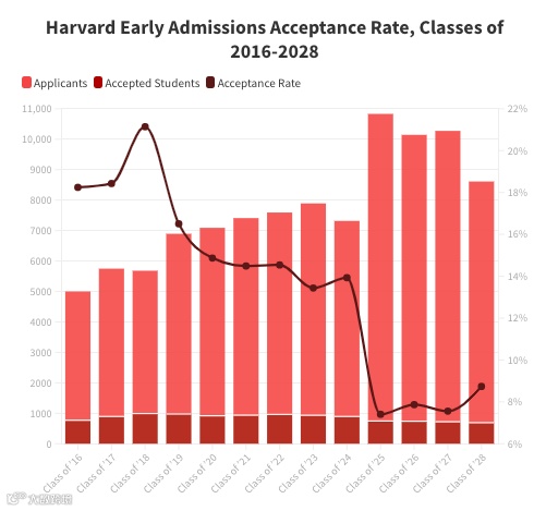 哈佛大学今年共收到7921人早申申请,录取692人,录取率为8.74%。