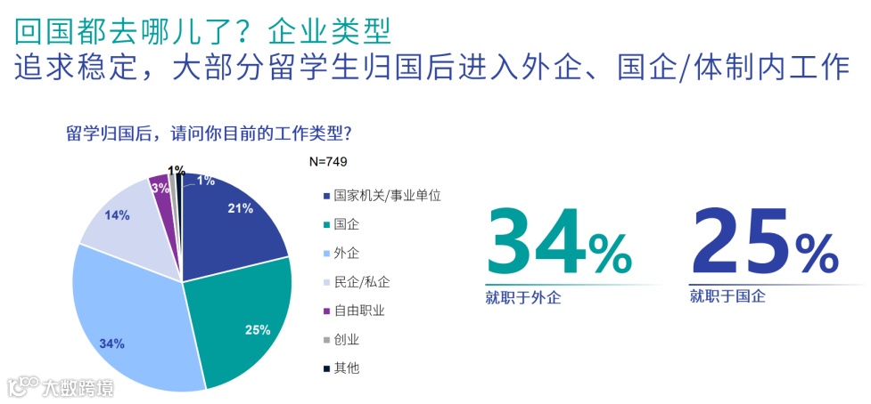 根据全球知名咨询机构益普索(IPSOS)发布的《海外留学趋势报告》来看,当时回国就业的80万留学生有21%进入了国家机关/事业单位,25%进入了国企,相加接近半数。
