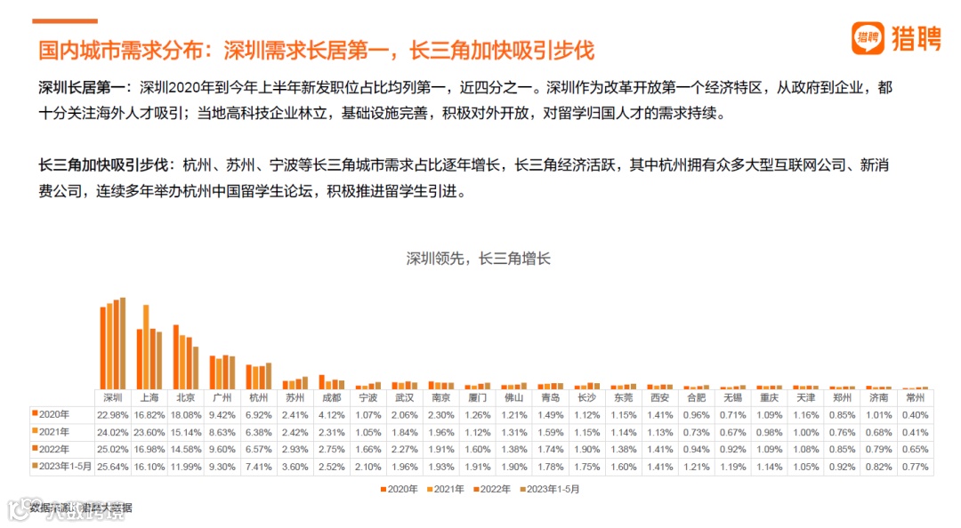 留学归国人才的需求呈现出强劲增长态势,特别是在2023年前五个月,新发布的留学归国人才职位需求已超越2022年全年总量,增幅高达34.2%。