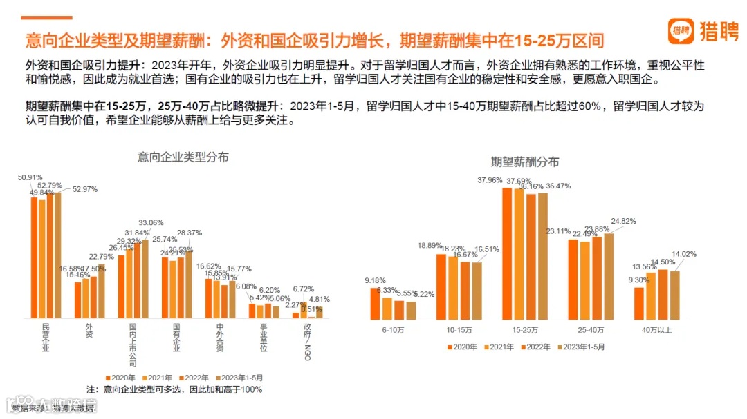 外资企业以其熟悉的工作环境和重视公平性的特点,成为留学归国人才的首选;而国有企业则以其稳定性和安全感吸引更多留学归国人才。