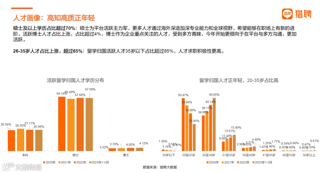 留学归国人才活跃度显著提升:2023年前五个月,留学归国活跃人才数量较去年全年增长了17.1%,显示出这一群体在就业市场上的高度活跃性和积极寻找机会的态势。