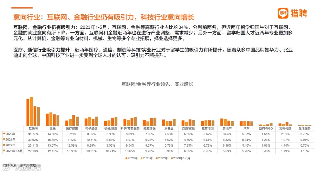 尽管互联网和金融行业对留学归国人才的吸引力有所下降,但仍占据意向行业前两位,占比约34%。这主要受到行业调整和留学归国人才专业多元化的影响。