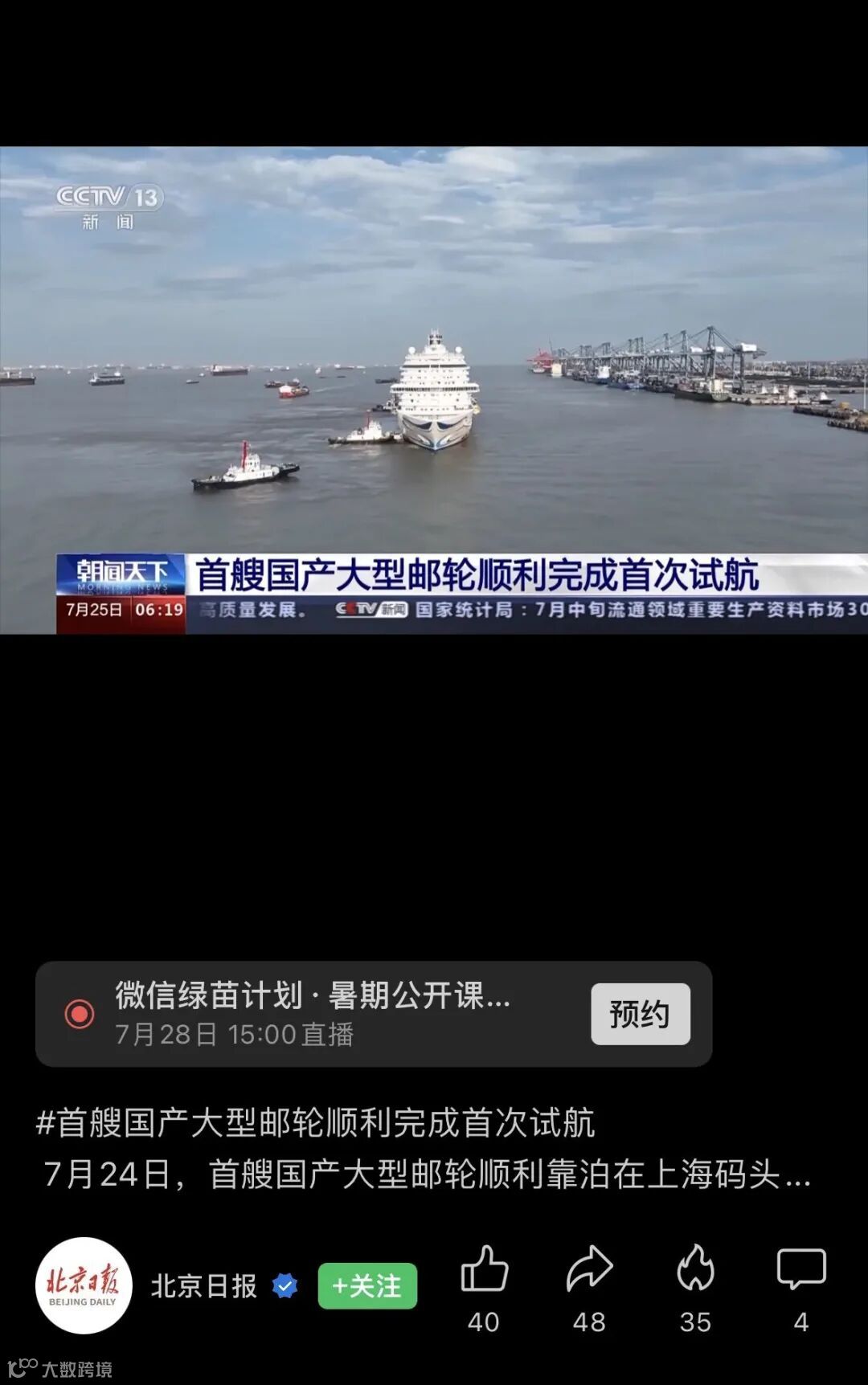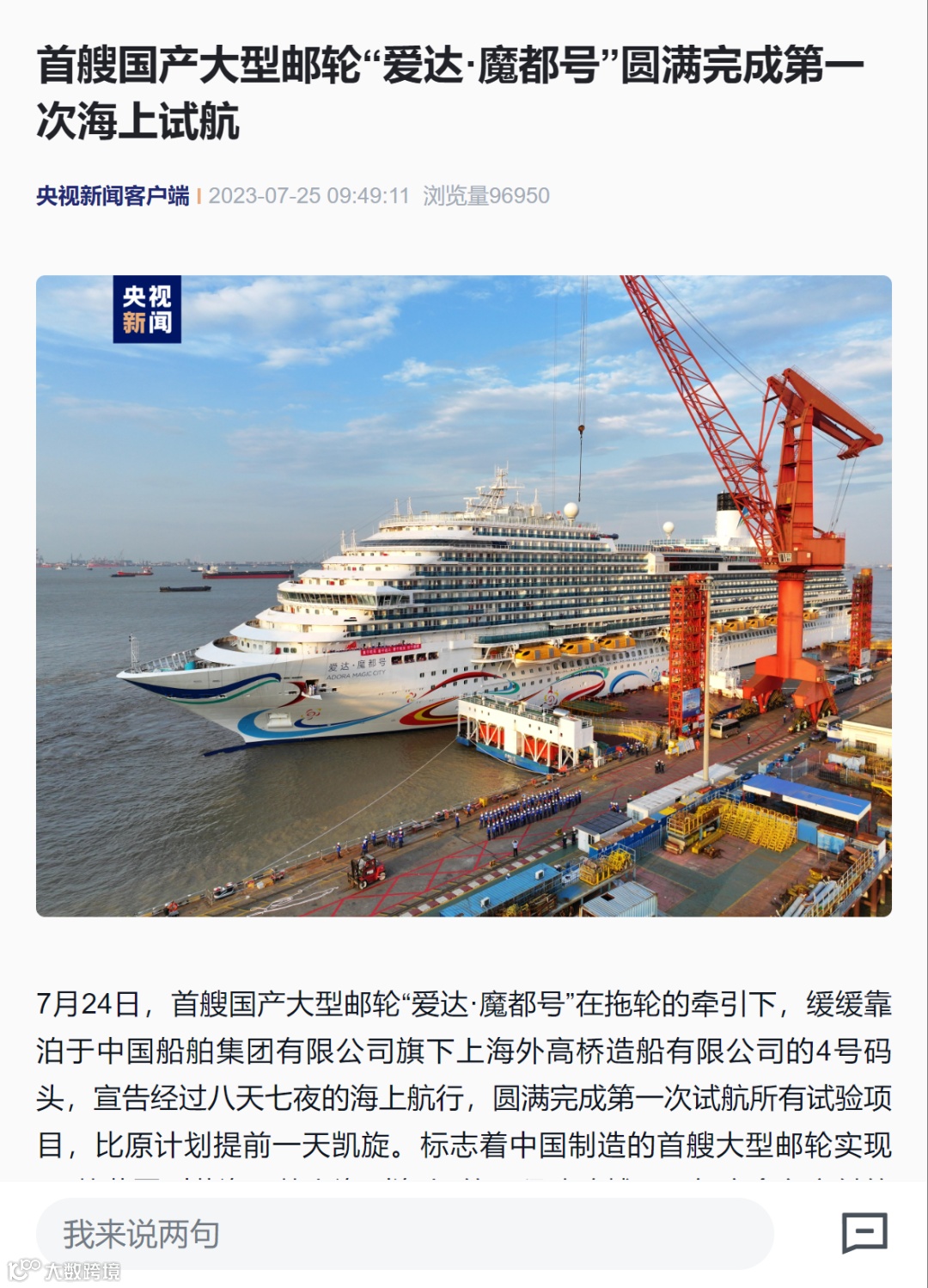 7月24日,在拖轮的牵引下,首艘国产大型邮轮“爱达·魔都号”缓缓靠泊中国船舶集团有限公司旗下上海外高桥造船有限公司的4号码头。(点击上方↑文字,回顾新闻详情吧~)