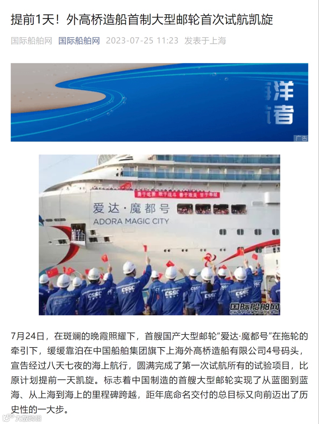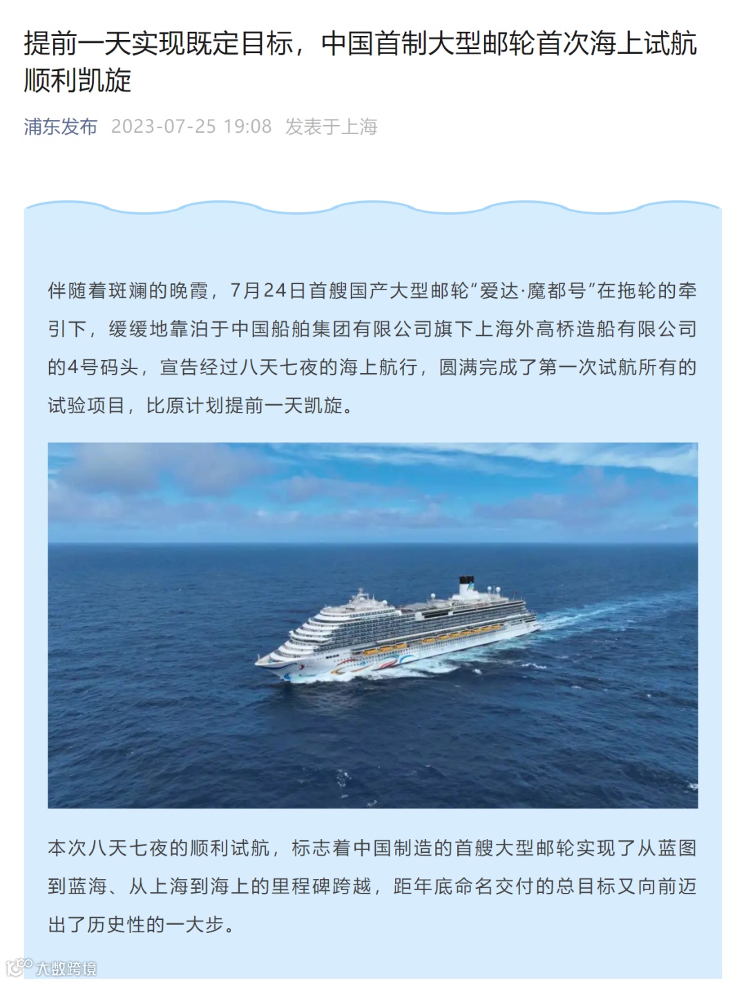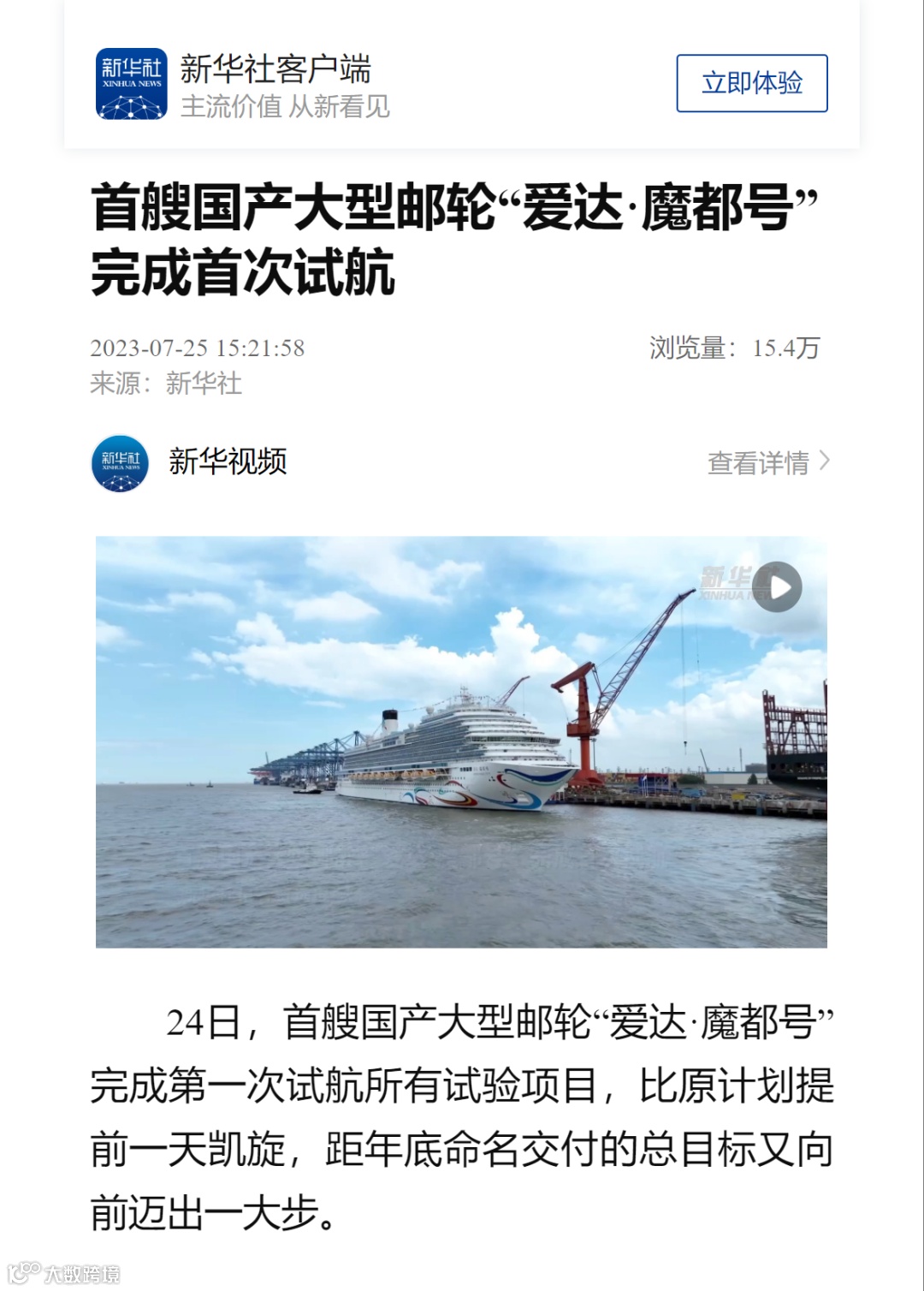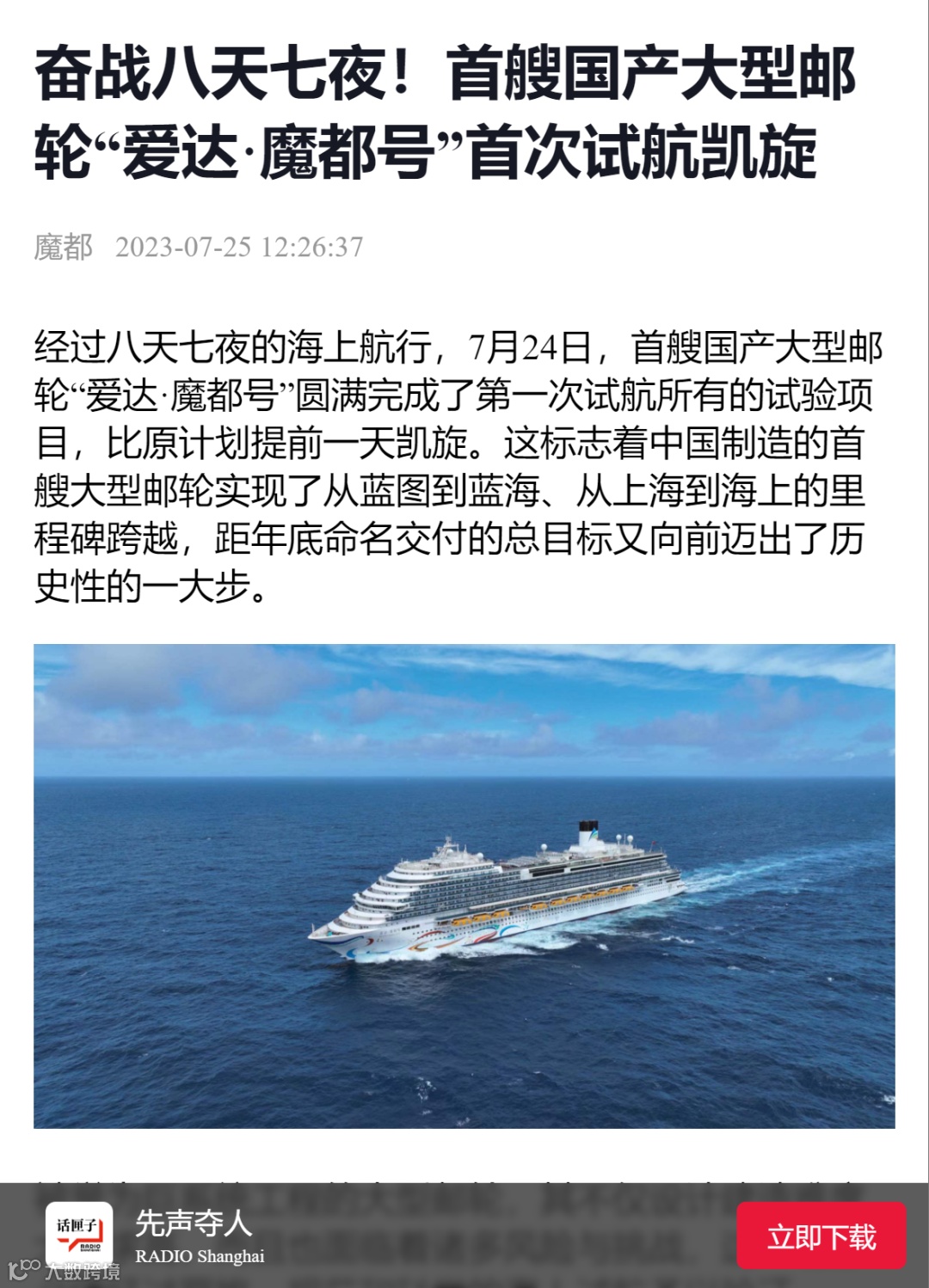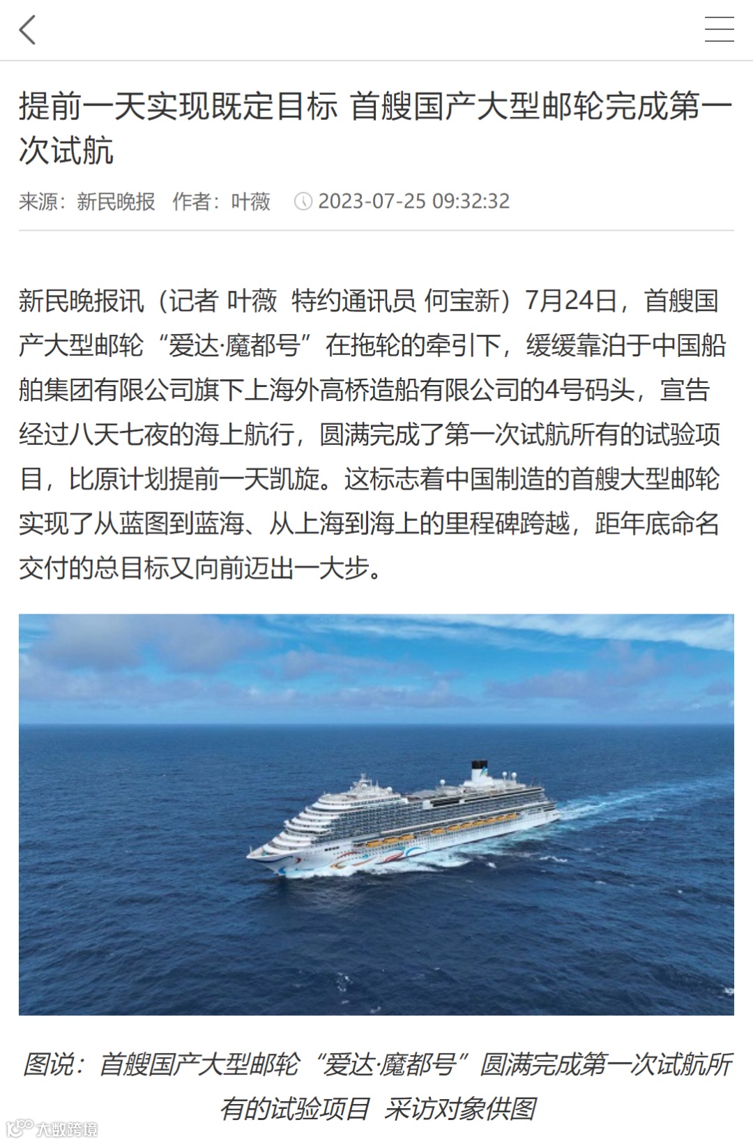 经过八天七夜的海上航行,“爱达·魔都号”圆满完成了第一次试航的所有试验项目,比原计划提前一天凯旋。这是中国船厂首次完成大型邮轮试航,创造了中国造船业的历史!