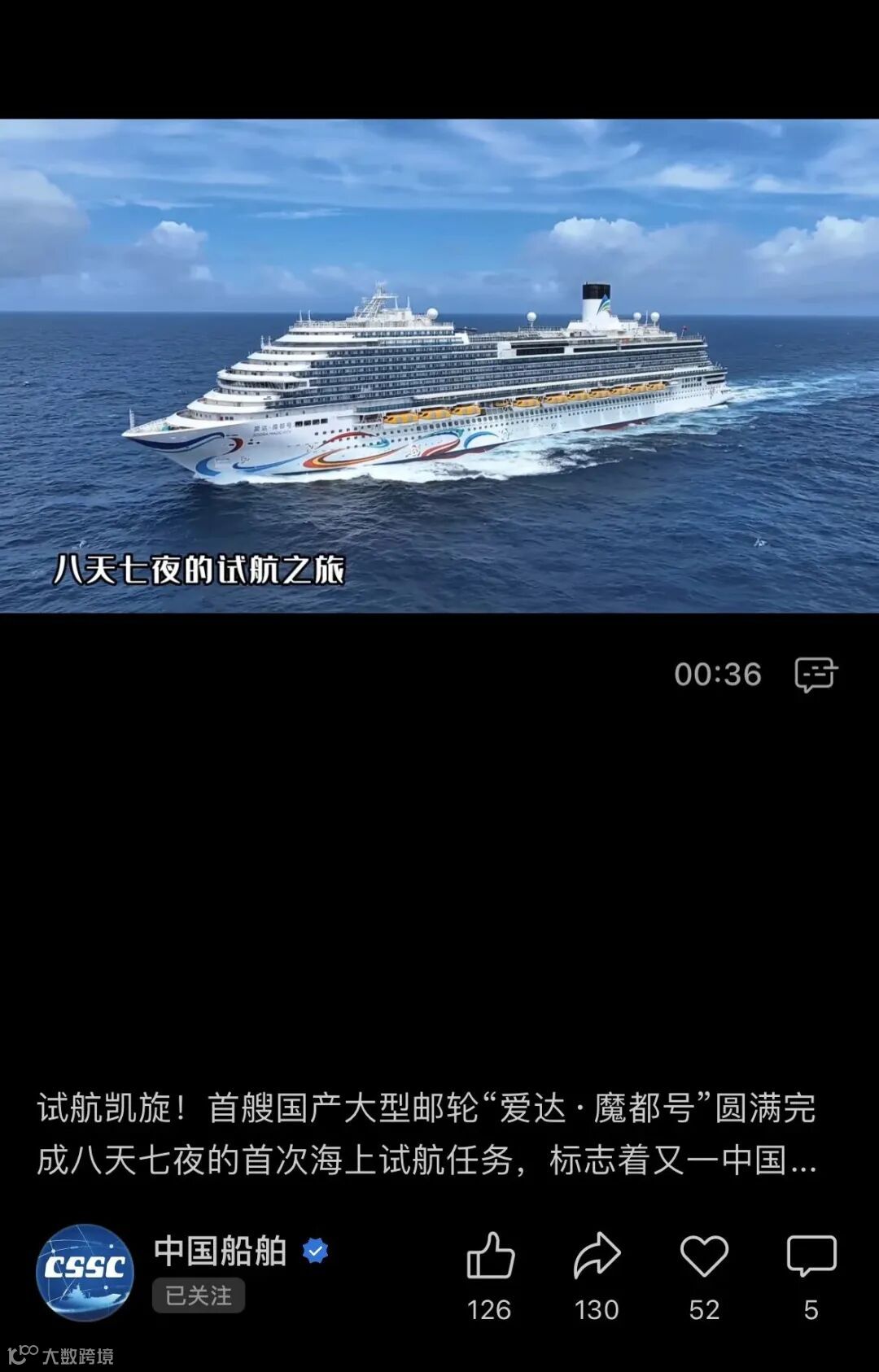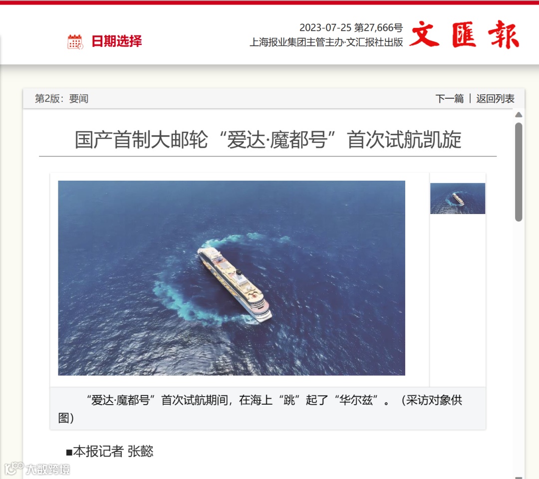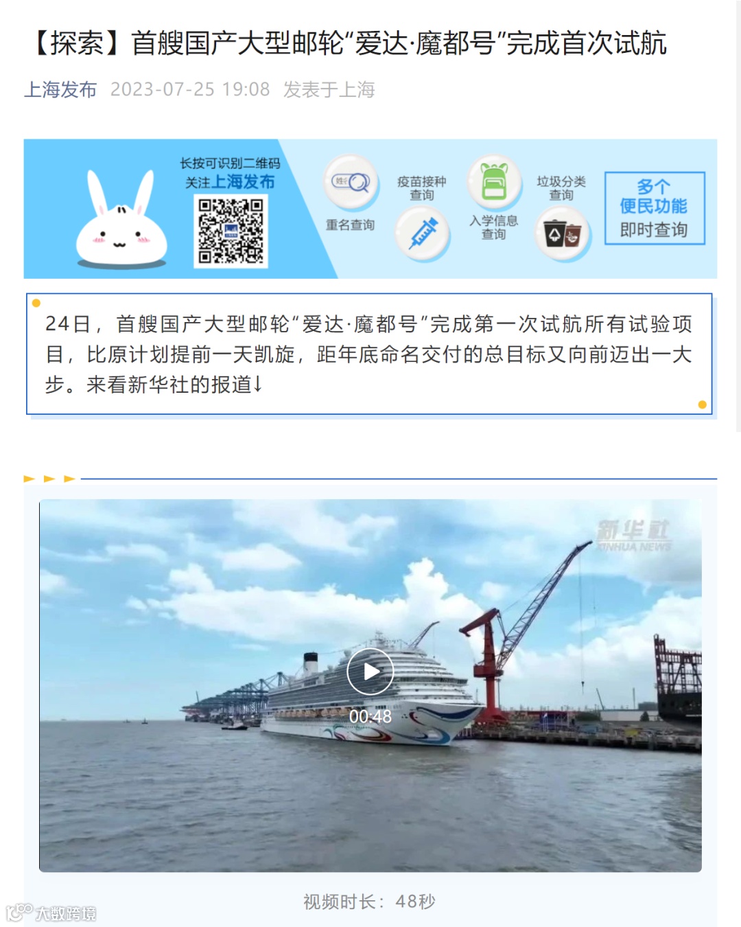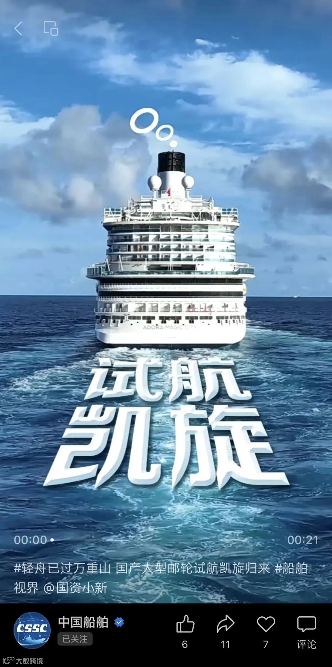 经过八天七夜的海上航行,“爱达·魔都号”圆满完成了第一次试航的所有试验项目,比原计划提前一天凯旋。这是中国船厂首次完成大型邮轮试航,创造了中国造船业的历史!