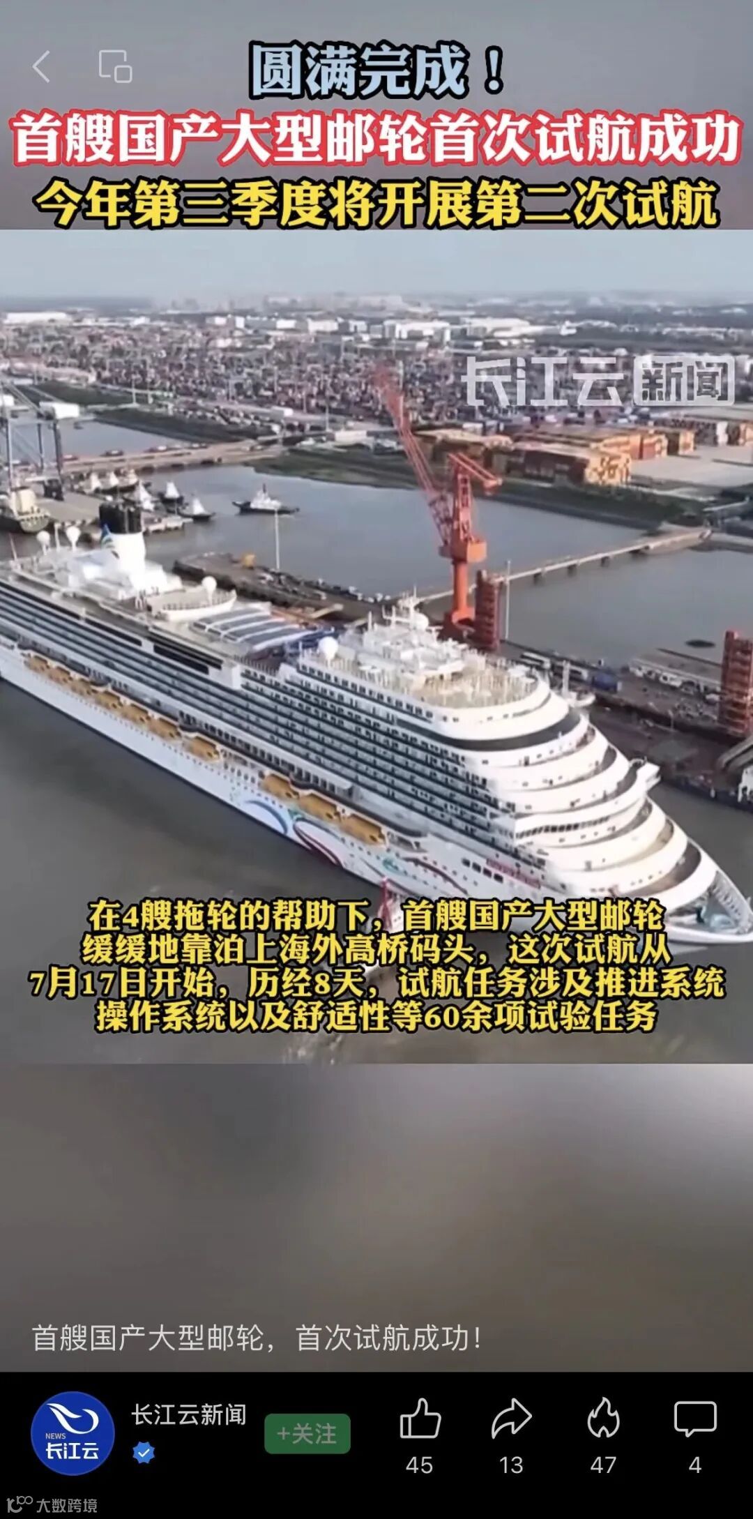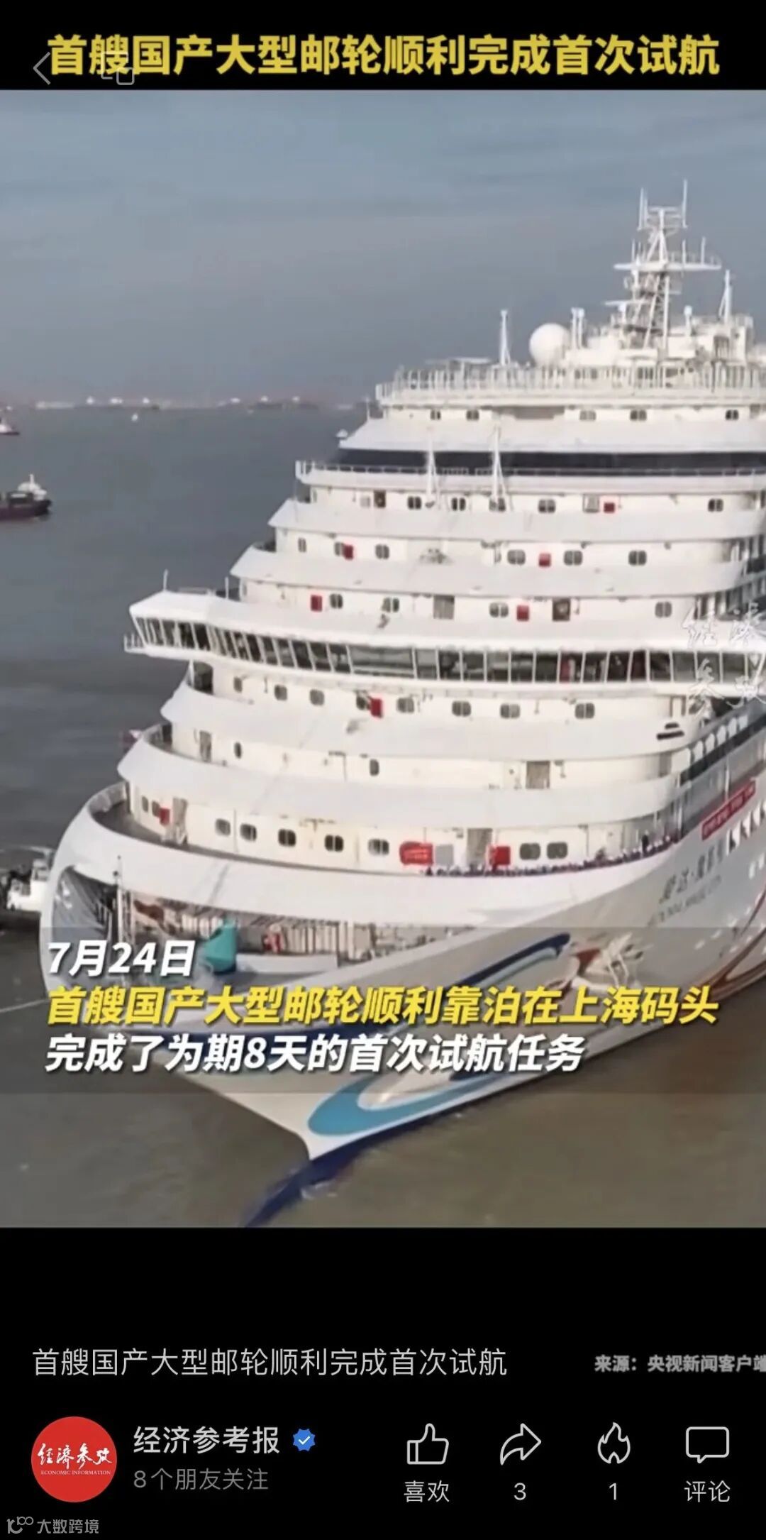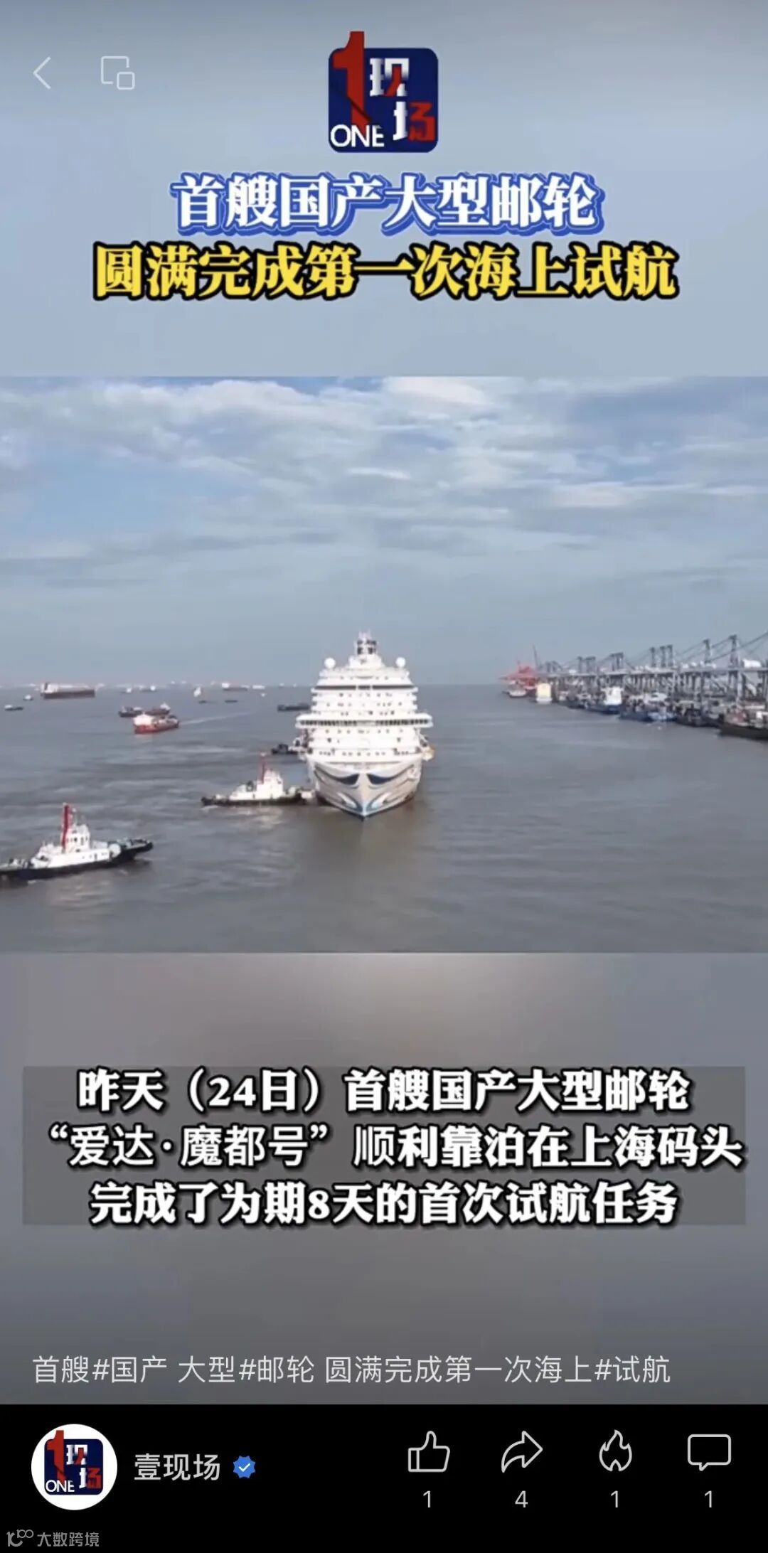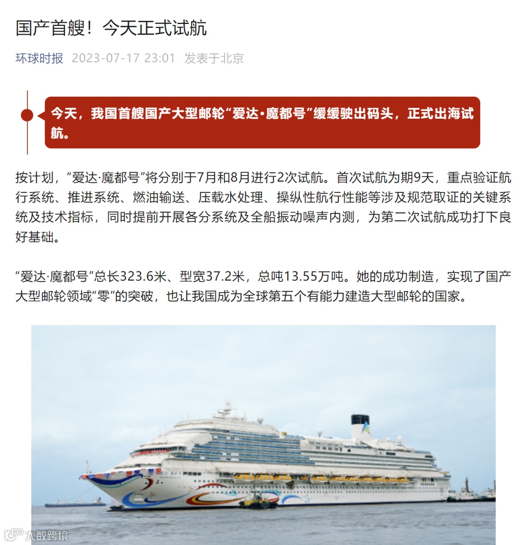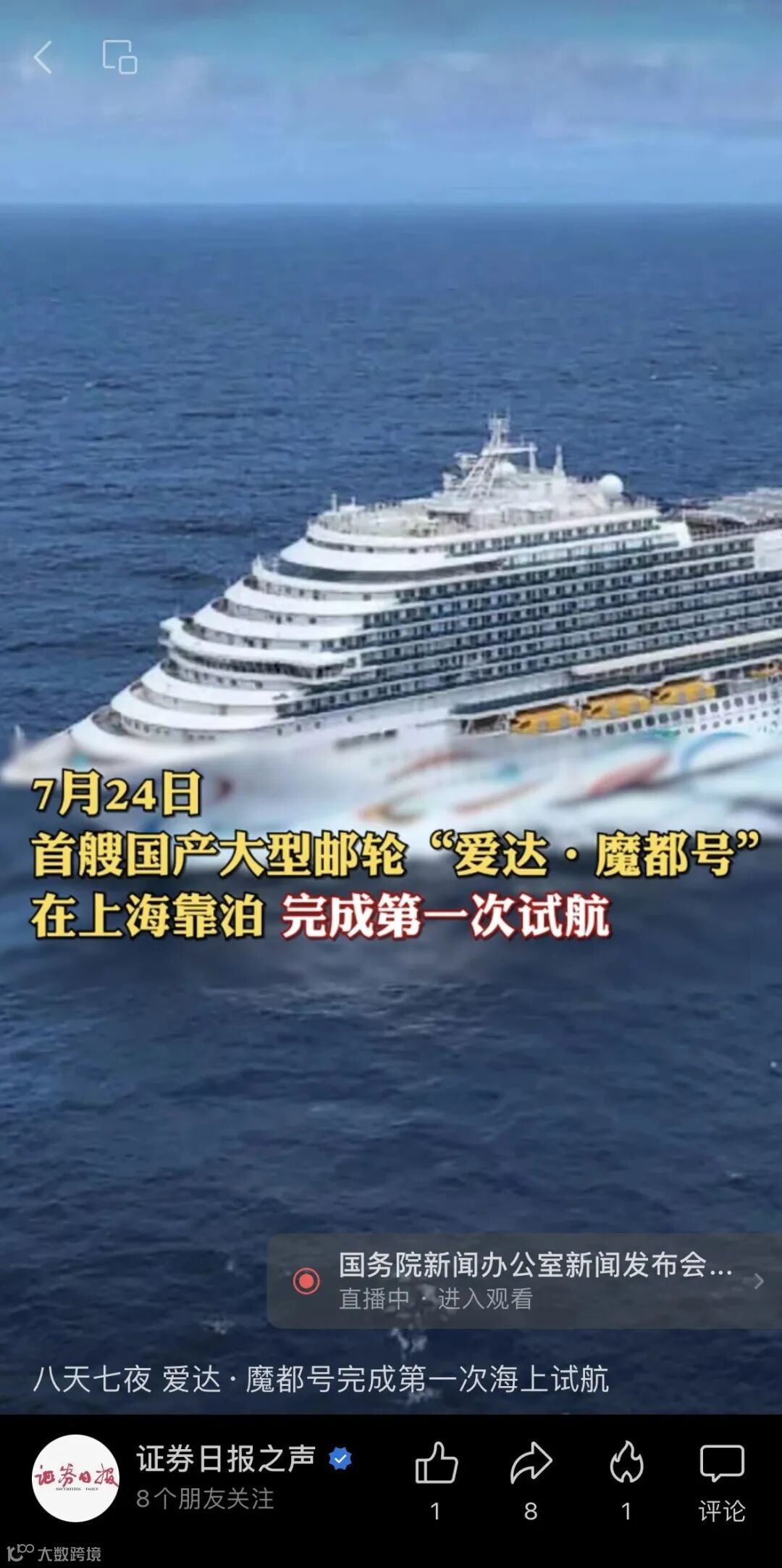 经过八天七夜的海上航行,“爱达·魔都号”圆满完成了第一次试航的所有试验项目,比原计划提前一天凯旋。这是中国船厂首次完成大型邮轮试航,创造了中国造船业的历史!