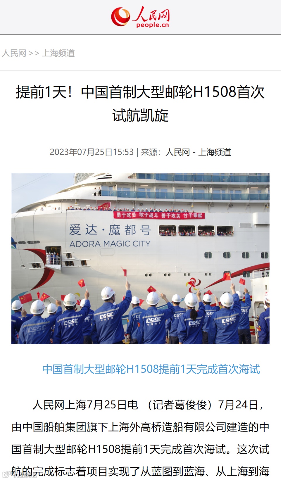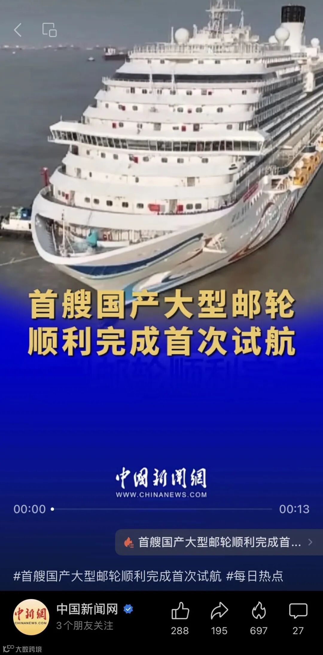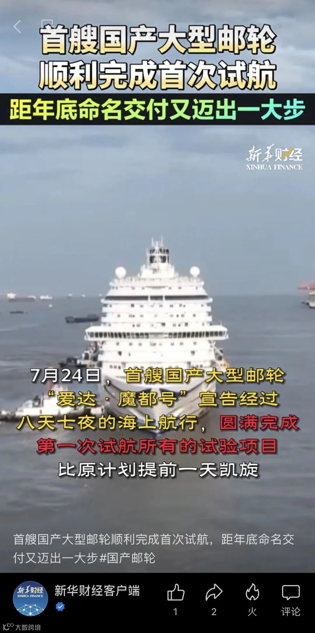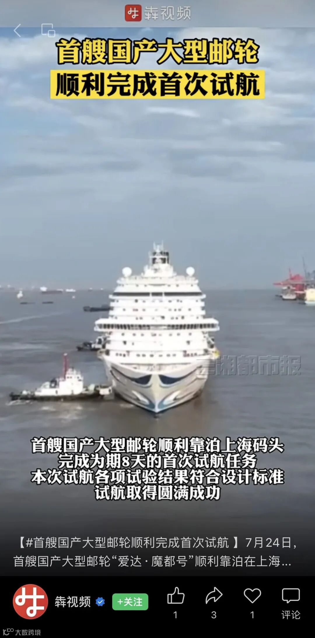 经过八天七夜的海上航行,“爱达·魔都号”圆满完成了第一次试航的所有试验项目,比原计划提前一天凯旋。这是中国船厂首次完成大型邮轮试航,创造了中国造船业的历史!