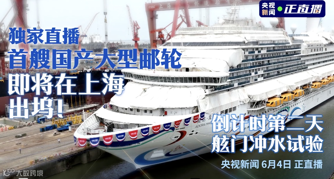 6月4日,国产首制大型邮轮开始舷门冲水试验。