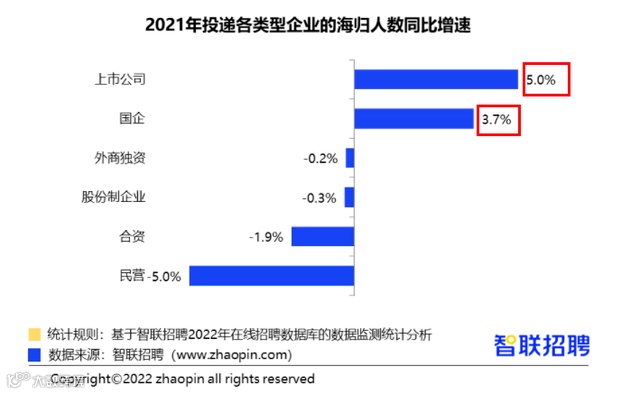 根据《2021中国海归就业调查报告》,在调查样本中:21年向国企投递简历的海归人数同比增长3.7%;