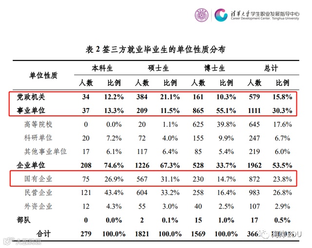 清北发布的《2021毕业生就业质量年度报告》显示,清华大学 2021 届毕业生中,签三方就业毕业生总数为 3669 人,前往党政机关、事业单位、国有企业等体制内单位就业的人数占比为 69.9%,较 2020 年上涨 5%。