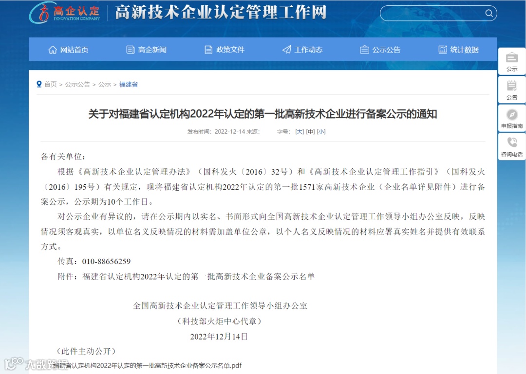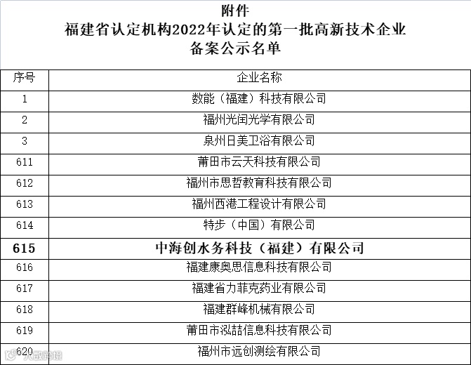 2022年喜报频传,中海创水务科技在获得国家级科技型中小企业、福建省软件产品认定、福建省软件企业认定后,又获得国家高新技术企业认定荣誉!
