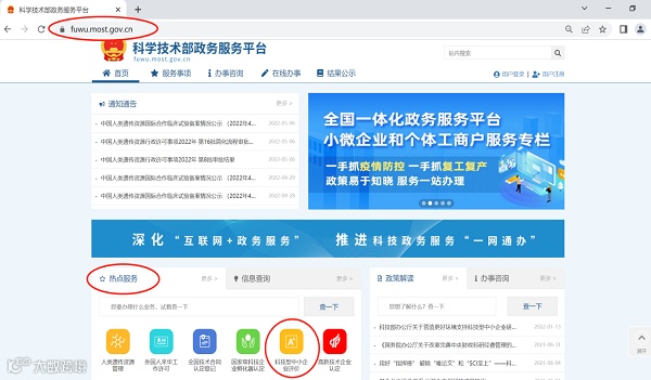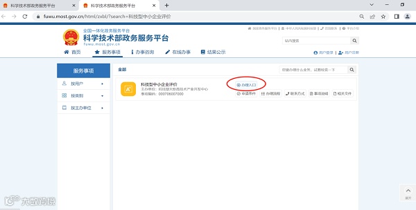 企业访问全国一体化政务服务平台科学技术部政务服务平台(https://fuwu.most.gov.cn),点击“热点服务—科技型中小企业评价”,进入界面后,点击“办理入口”。