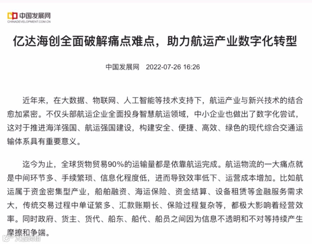 福建亿达海创科技有限公司由荣亿达集团与中海创科技集团合资成立,汇聚双方30年航运经验与30年技术积累,致力于通过全职能与全生态协同的智慧航运平台,打造真实、实时、可视化的数字孪生船舶,加快数字航运建设,以数字化转型带动海运行业生产方式、运输方式、管理方式的变革。