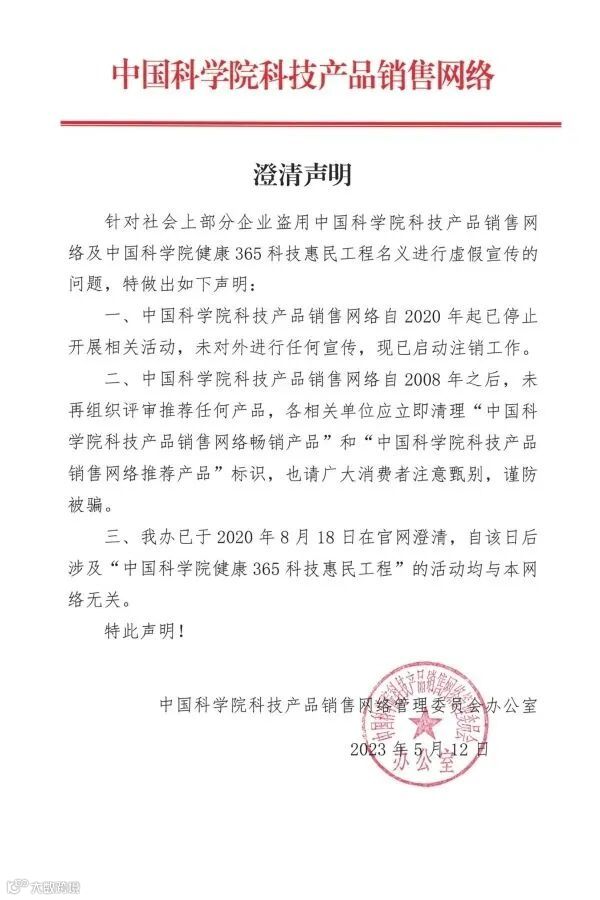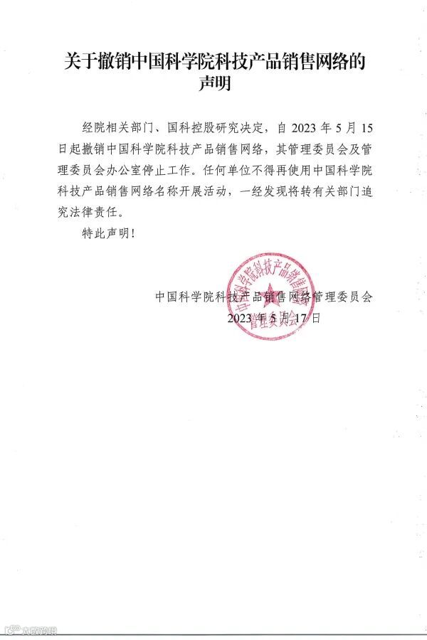 《关于中国科学院科技产品销售网络管理委员会停止工作的声明》(转载)