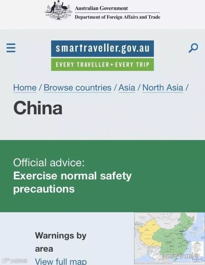 不仅如此,政府还会给你出国的安全系数指导,让你了解你所在地区的安全指数。比如中国,大部分区域是安全的: