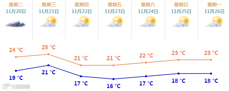 预计明后两天我市阴天转多云,间中有零星小雨或轻雾,气温较为平稳舒适;本周中后期因冷空气活跃,气温逐渐下降,早晚较凉,请注意及时增添衣物,谨防感冒。
