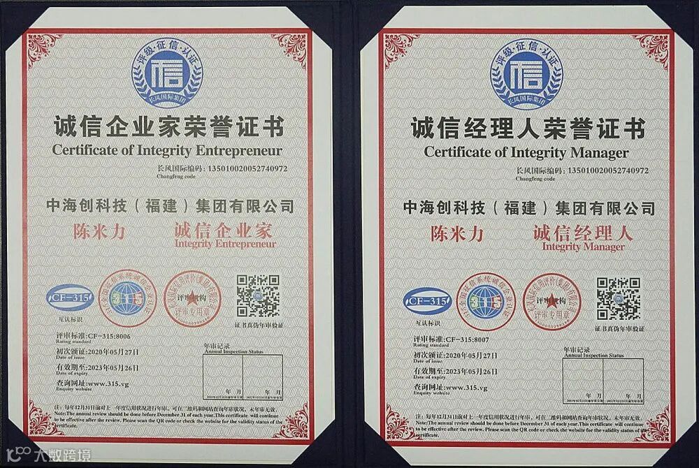 近日,经长风国际权威信用机构审核认证,中海创科技集团获评AAA级信用单位、AAA级质量服务信誉单位、AAA级诚信经营示范单位、AAA级重合同守信用单位,并获得AAA级资信等级证书、AAA级信用等级证书,董事长陈米力荣获诚信企业家及诚信经理人称号。
