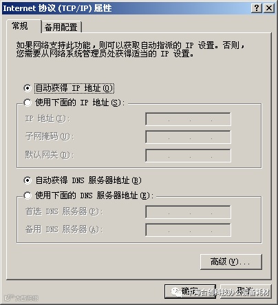 右键点击“网上邻居”→属性→右键点击“本地连接”→属性→常规→选中“Internet协议(TCP/IP)”→属性→选中“自动获取IP地址”(忽略下面的DNS选项) →确定→OK,如下图: