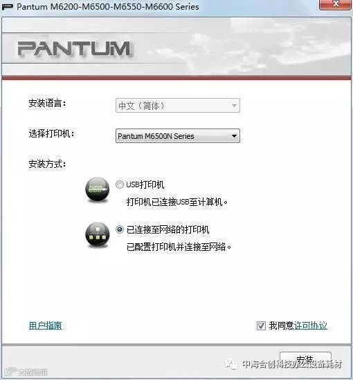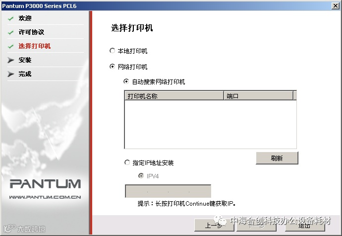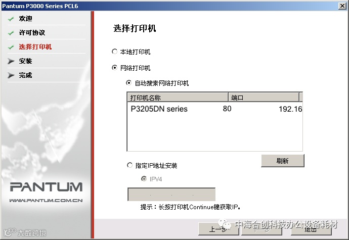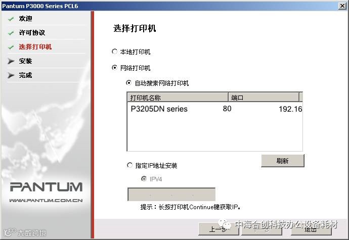 2. 奔图的网络打印机,出厂默认自动获取IP地址,接入网络正常情况下都能获取到IP地址。然后按照驱动程序的指引直至完成。